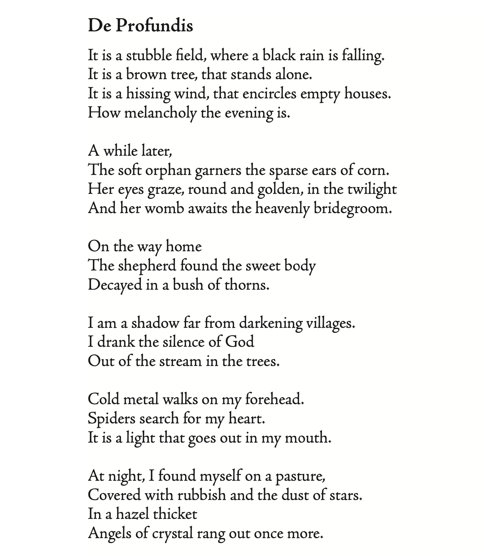 >>24843540>They all rely on the same formula: I feel like it's just "this happens/and there's this/and also this/in other news" and it gets repetetive really fast.Very valid but that's whole Trakl. I don't care about formal structures. What I find fascinating in Trakl is his imagery and the way he creates his own strange world with it like a mad prophet. Most of it is impenetrable but who cares? I like the way his poems make me feel.
