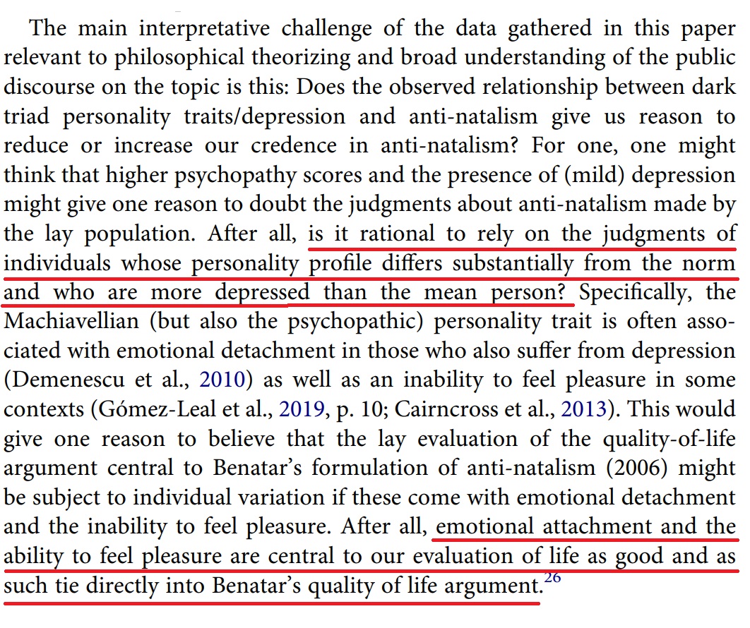 This doesn't mean that anti-natalist arguments can be dismissed solely due to this fact (inb4 crying about ad hom); it does however add context to why autists make these threads and are completely unable to understand why they are wrong. It also has direct implications regarding Benatar's quality of life argument (i.e. anti-natalists are stuck in a rigid ideological system as a cope for to sustain their defective worldview).