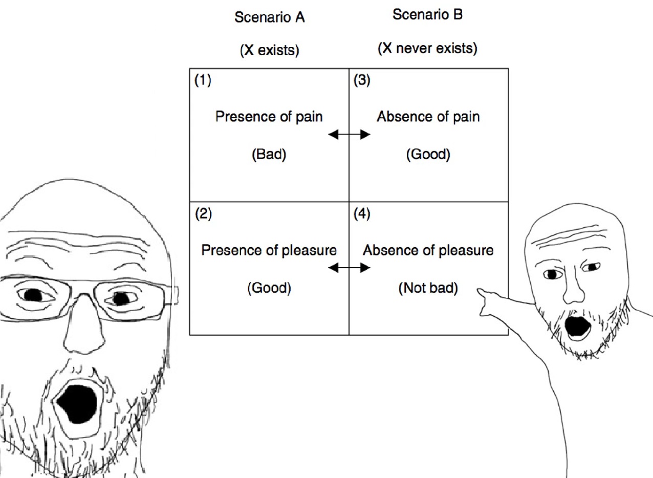 Benatar's whole thing relies on this sneaky bait-and-switch that's honestly embarrassing once you see it. When he talks about avoiding suffering he's like "well obviously the potential person would want to avoid pain if they could choose" treating them as a rational agent with preferences. But then when it comes to missing out on pleasure he suddenly goes "wait there's nobody there to be deprived lmao" treating them as complete nothingness. Pick a lane, dude. Either the non-existent person is something we can reason about counterfactually (in which case they could just as easily prefer existing despite the suffering) or they're absolute void (in which case we can't say shit about whether avoiding their pain is good either). The whole asymmetry collapses into perfect symmetry the moment you force him to be consistent. His supporting intuitions about procreation duties are cope too, plenty of normies explicitly say they had kids so the kids could enjoy life's goods, so miss me with that "nobody thinks this way" nonsense. Bottom line is if you want to make the antinatalist case just describe how much life actually sucks materially instead of trying to logic-proof it with this broken formal argument. At least that's honest.
