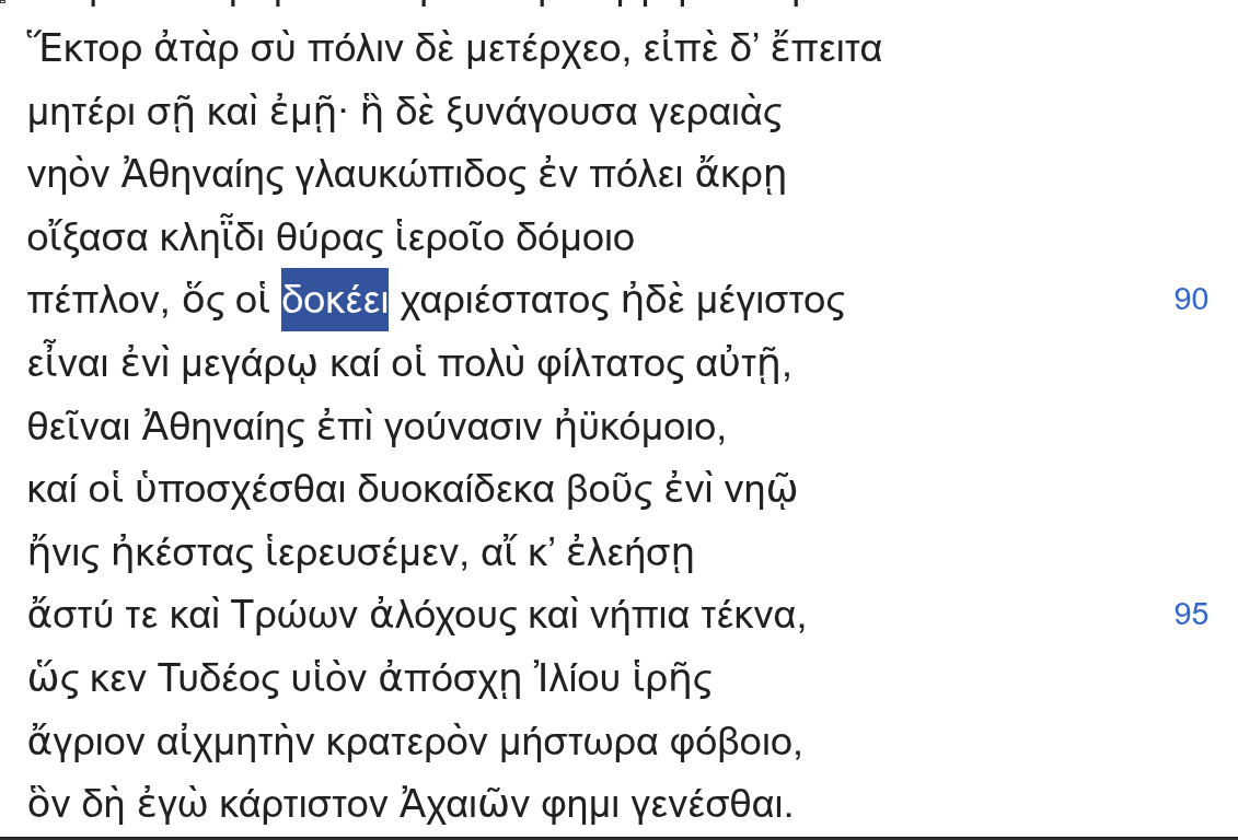>>24926342*epsilonHomeric and Ionic don't contract nearby vowels regularly like Attic does, so you often have these "encounters" so to speak as in this case, where the root of the verb δοκε- ends in a vowel, epsilon, and is regularly attached to the third person singular ending ει(ε[thematic vowel] + ι)