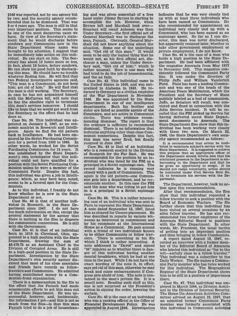 >>24934265The point is that the framing is completely dishonest and does not accurately reflect either the record of the circumstances or what was actually said, and you clearly did not bother to read the source material (here's the specific page, first column, 2/3 of the way down)Before presenting the cases by number, he said this:>I shall not attempt to present a detailed case on each one, a case which would convince a jury. All I am doing is to develop sufficient evidence so that anyone who reads the RECORD will have a good idea of the number of Communists in the State Department.He was quite obviously not saying 'it is the case that #40 is guilty because there is no evidence to the contrary'Instead, he was articulating suspicion of the numbered individuals with varying degrees of evidence, and we do not know what specifically, if anything, in #40 was corroborated in his copy of the State Dept. file, or the other bases for the suspicion of #40 strictly from the record in question (if one does some digging, one can find that #40 was suspected in an unresolved investigation submitted to the House Appropriations Committee in 1947)He was not, at any point, 'asked for evidence to back up' the case of #40, or to elaborate on that case at all, which makes the framing>this statement by Senator Joseph McCarthy when he was asked for evidence to back up his accusation that a certain person was a Communistflagrantly false