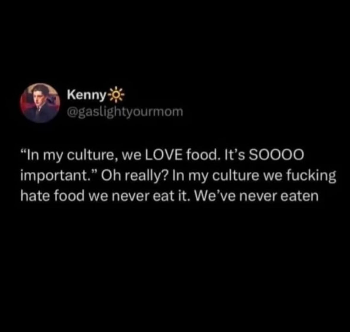 >>24970870funny post but it misses the point, "In my culture we love food and it's so important" is just a way to observe, albeit in a very rudimentary and unrefined way, that some cultures value the simple pleasures of life more than others, eating and especially communal eating being one of them. Also confuses eating to survive with all the other things food can be culturally tied to, which is funny because it kinda proves the observation is correct.