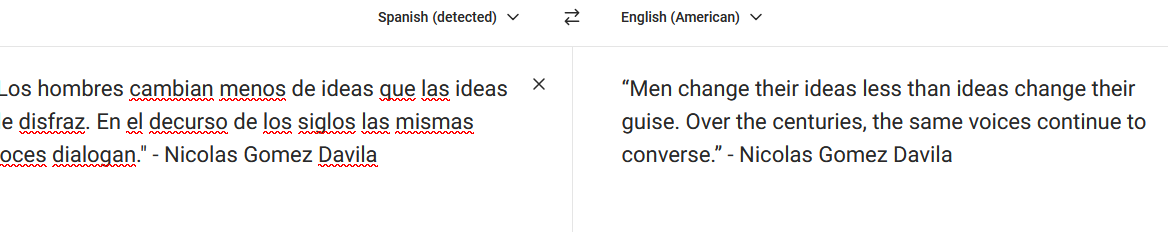 >>24980201i barely know any spanish despite growing up in a spic city but from what deepl is telling me, it sounds like he's trying to say that ideas are rarely truly novel, rather that they come back throughout the ages rephrased. wikipedia (yeah i know i know) says he hates modernity and is studied in germany so it may well be him rephrasing how history runs in cycles except with ideas.