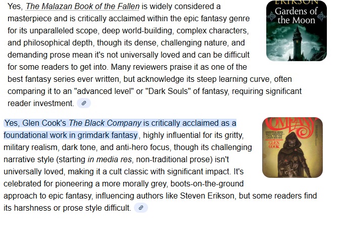 >>25002811What confuses me is that they both are, for good or bad, quite niche, and only well-known among some circles of fantasy enthusiasts. Average reader is very unlikely to ever hear of either - no accolades, no adaptations, minimal media presence, few editions of their work none of which ever made bestsellers, and hardly any other author ever mentions them. But the last dozen or so threads gets into this larp that they are somehow critically acclaimed mainstream pillars of fantasy with massive recognition and influence. Like, what? >>25002813>by a lot of peopleThis lot of people, is it in the thread with us right now?