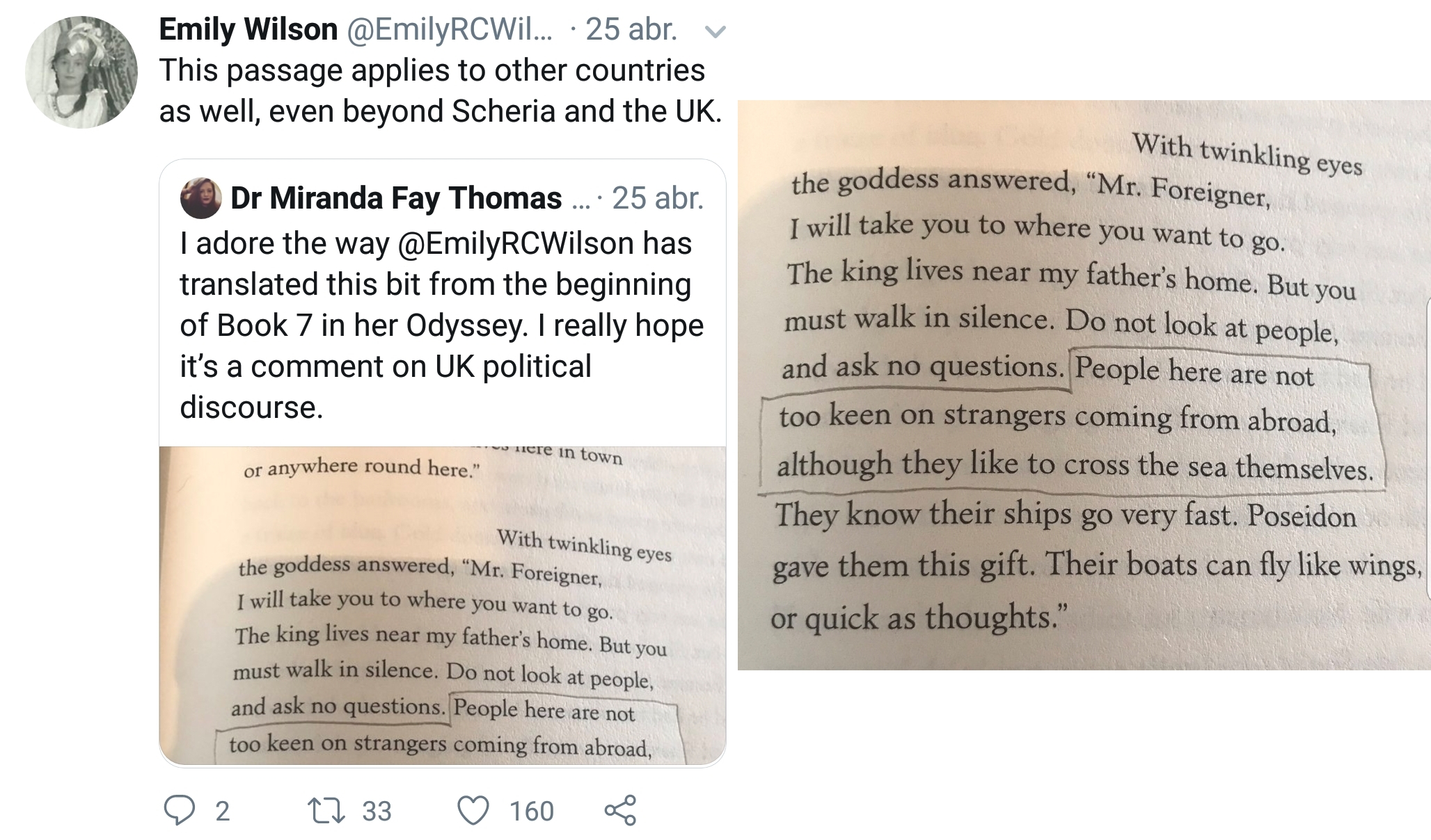 >>25006032>Homer's poetry isn't meant to be flowery, that was a choice of previous translators,Not since Pope or thereabouts. 20th century translators inclined toward the terse and primal quality in Homer‘s content and verse. Wilson honest to god sounds like an ESL who is picking words from an elementary dictionary and learning what iambic pentameter is as she goes.