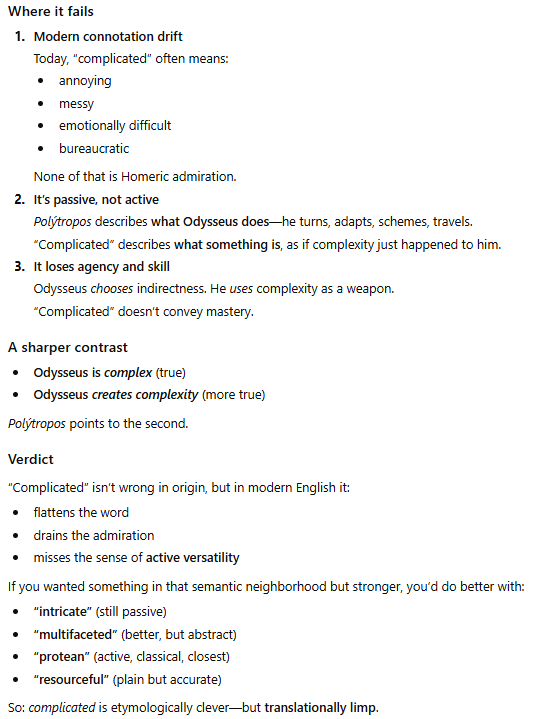 I asked ChatGPT, didn't bring up Wilson, just asked if complicated was a good translation for πολύτροπος. It said it etymologically fits but...