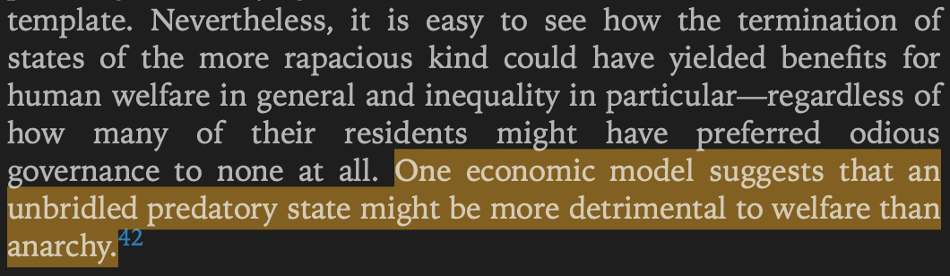 >>25038735>the amount of happiness is much highereven though>there might be fewer peopleWhen you have government control allowing rule of law and so large scale food distribution you can carry 10 times the population than when everyone has to secure their own safety in their nearby area under anarchy.The idea that people are 10 times happier living under anarchy than under an authoritarian government is nonsense.So an authoritarian government produces far more human happiness and wellbeing than anarchy.>a well-researched book that cites economic models?njgger the screenshot you posted admits that it's just cherrypicking one particular model. that's pure motivated reasoning and confirmation bias