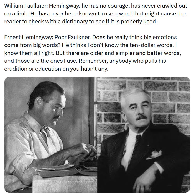 >>25039018Heming way sound like a redditor on r/clevercomebacks in this.Gotta give it to Faulkner.