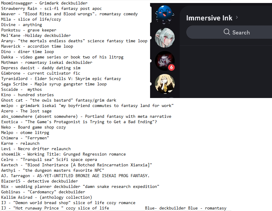 >>25042235loremaster hereImmersive Ink mods were in bed with grossly exploitative publisher Shadow Light Press, helped funnel clueless authors into them. The contract SLP was giving to authors is genuinely funny to read through. Drama ensued and Immersive Ink admins deleted the server. Got big enough people like Daniel Greene covered the topic, was very funnyGo find the infinite reddit threads if you care about the details>Daniel Greene covered itAnd I think he deleted that video lol, couldn't find it. he mustve been threatened with legal action