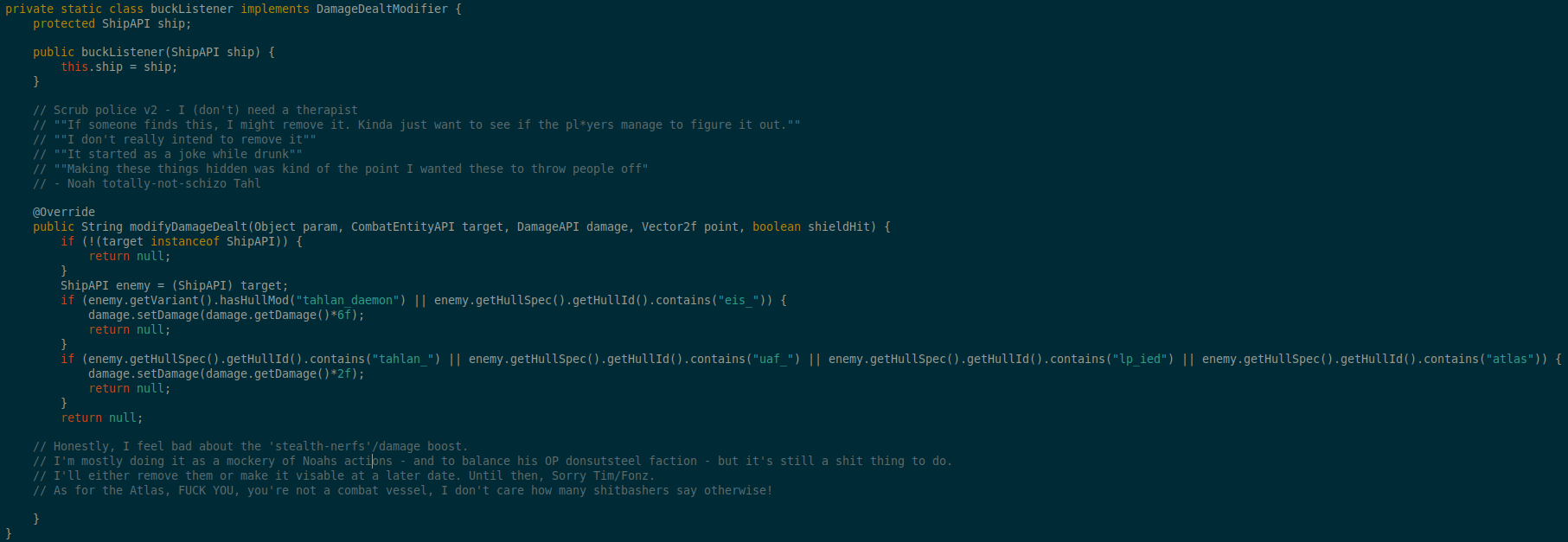 >>25042479in case you don't understand what is going on in that image, tldr:Noah Tahl inserted code into his mods that caused the ships from his mods to selectively do more damage to ships from the mods of people he didn't like, to take less damage, so on and so forth. He then tried to play damage control when this got discovered and was seen seething in discord about learning how to obfuscate code. The screenshot is from a mod called Buckbreakers, which is a joke mod that, among other things, is meant to mock Noah. It goes far beyond that but this is the main explanation.