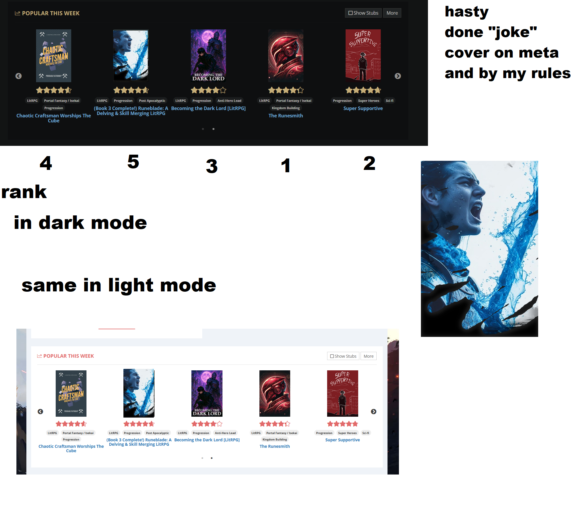 >>25048160>go look at any royalroad list and you'll see anime girl pics are the minority.tina here. just hbit RS and went down a few scrolls. you're right. way less anime girl covers than i expected. i spent too much time on moonquill i guess. i wonder if the trope will continue to die out. a lot looks like what trad fantasy covers sort of looked like back in the day.