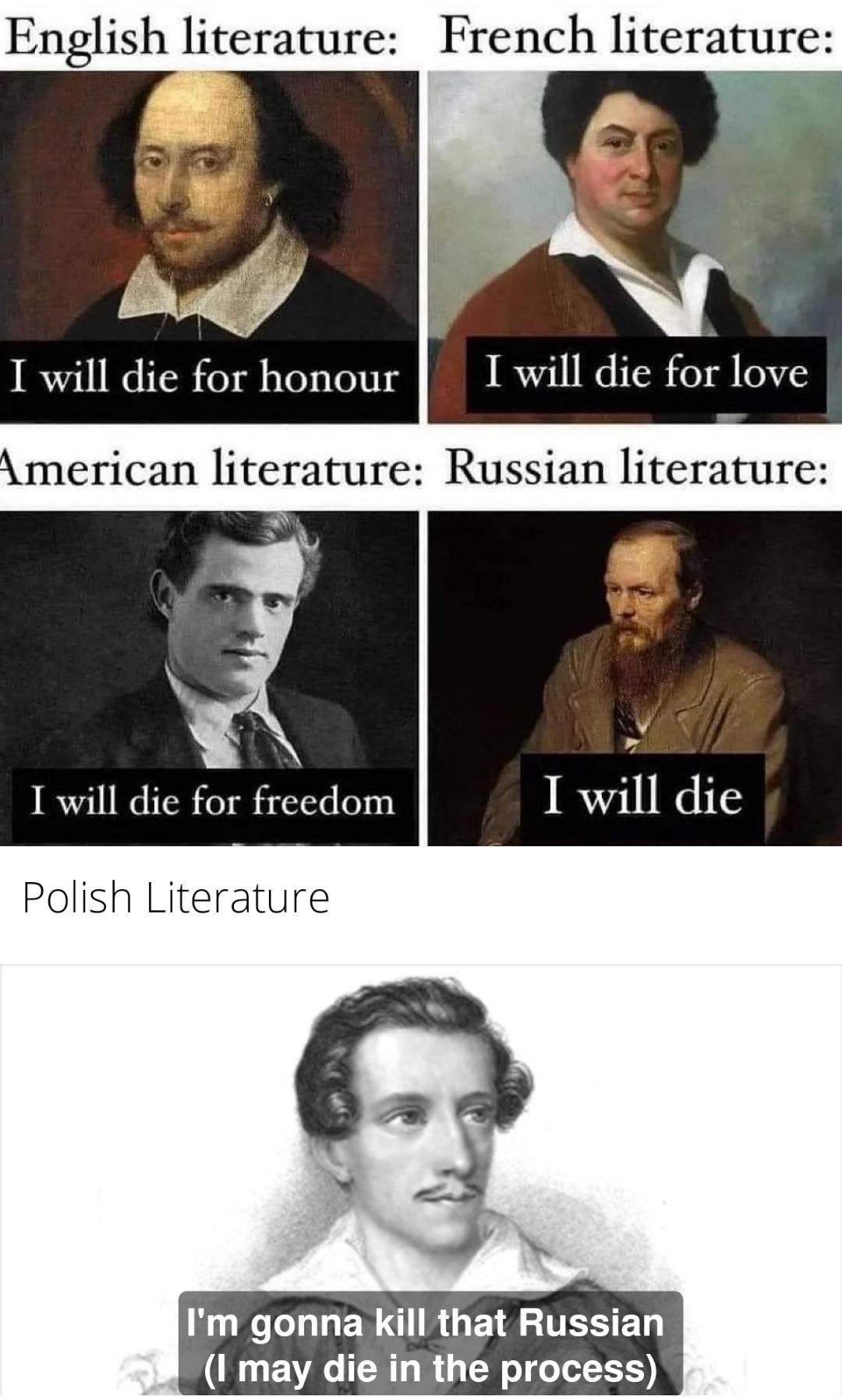 >>25042804Alternative version of this joke:British lit: does duty have meaning?French lit: does love have meaning?Russian lit: does suffering have meaning?German lit: no.