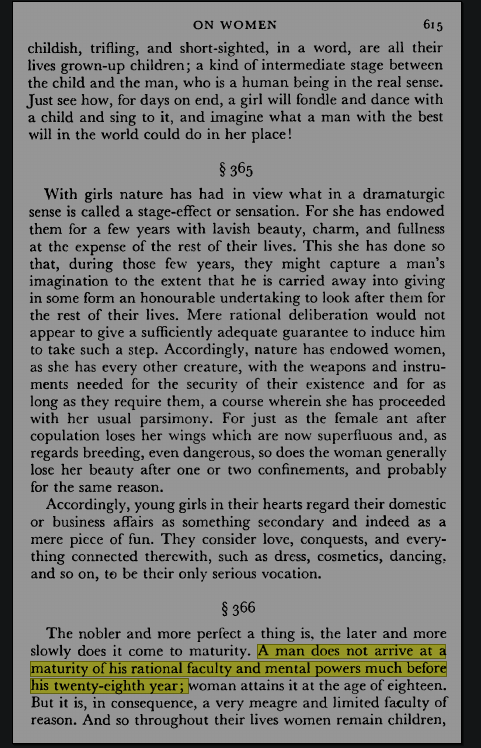 >>25048489Still learning and connecting pieces in early twenties. Leaving adolescence and reaching good intellectual capability still requires you to take a lot more experiences to turn some important processes into habits, to learn the adult world, develop a value philosophy.(pic from Schopenhauer, On Women)