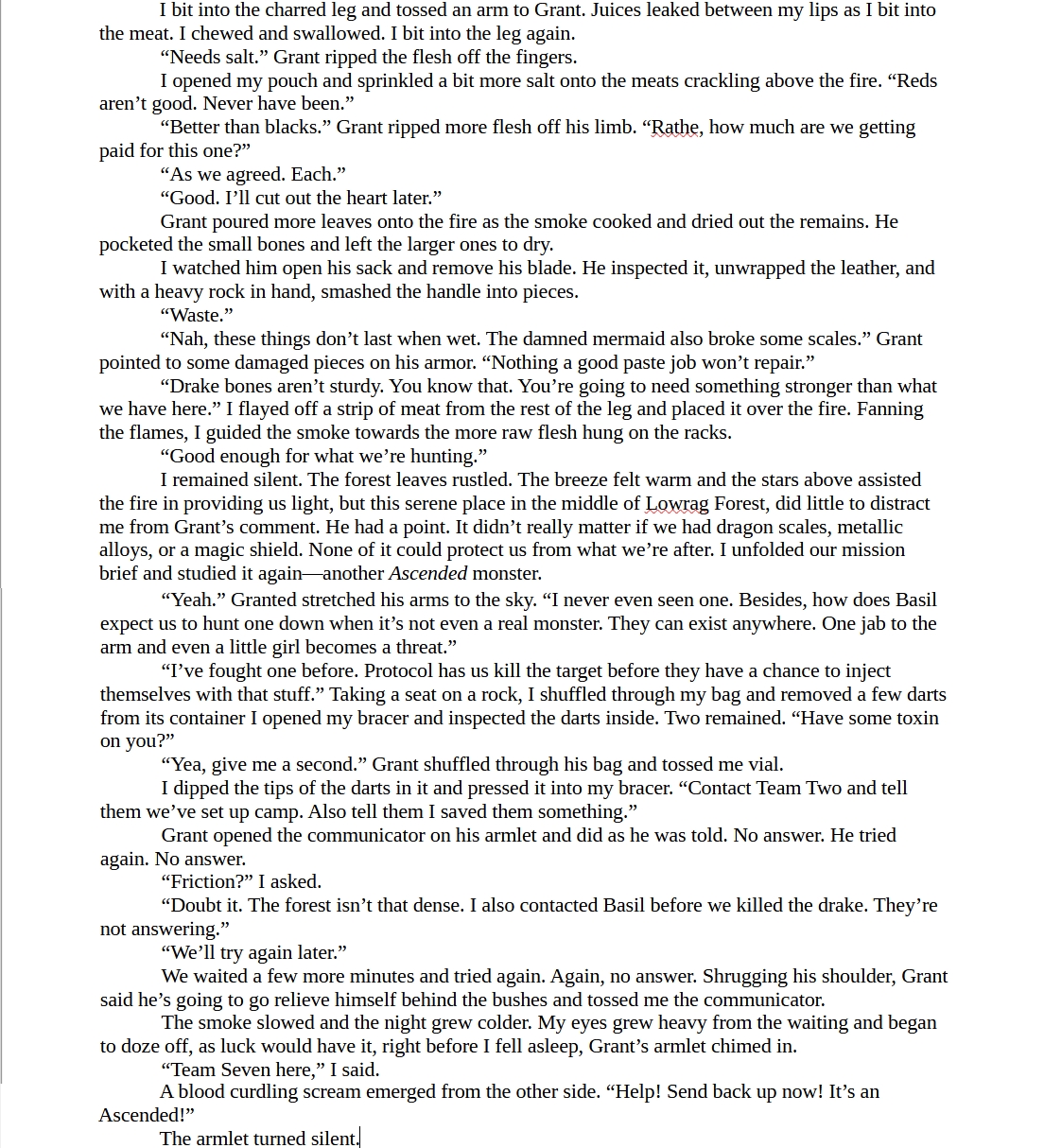 >>25054775You filtered me from the first paragraph.Remove,>I chewed and swallowed. I bit into the leg again.Don't describe micro-action.