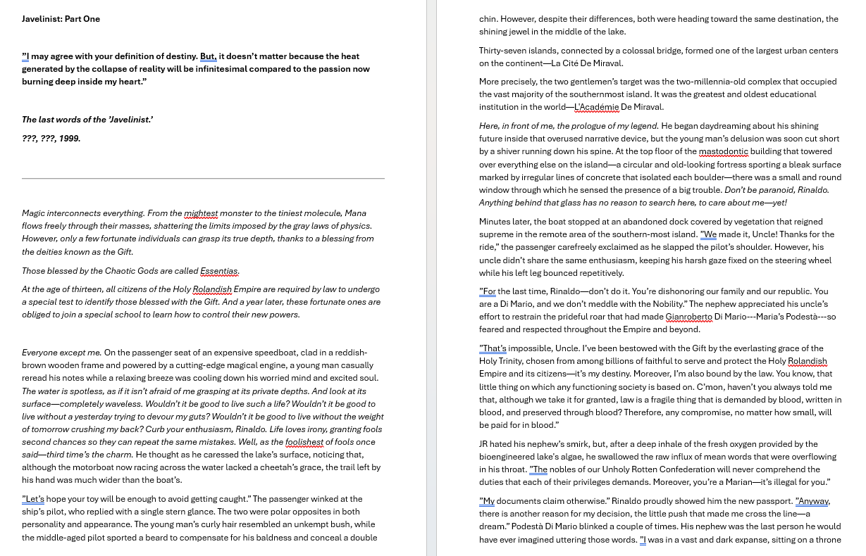 >>25054607>something you're good at and how you developed itI think I've gotten better at starting and finishing a scene/chapter. I don't go overboard with purple prose anymore like I would've 6 years ago.>something that needs improvement and how you intend to work on itThe editing. This first act is already finished and several chapters are edited to fit the new narrative, but it's just such a grueling process. I haven't started on the next chapter yet because I watched a friend play mgsv and figured I'd give it a try myyself (never played) but still diligently reading a few RR stories to study, and reading through Rendenvous with Rama. Clark's writing is easier to digest than Heinlein. Maybe I should look into getting some Clark's books since I liked his economic chapters in Rama. It's really hard to say where I need to improve since I don't get feedback at all. I'm hoping once I finish the rest of the editing (6/~20) maybe I'll start getting feedback for a full completed first act. But I'm not holding my breath.