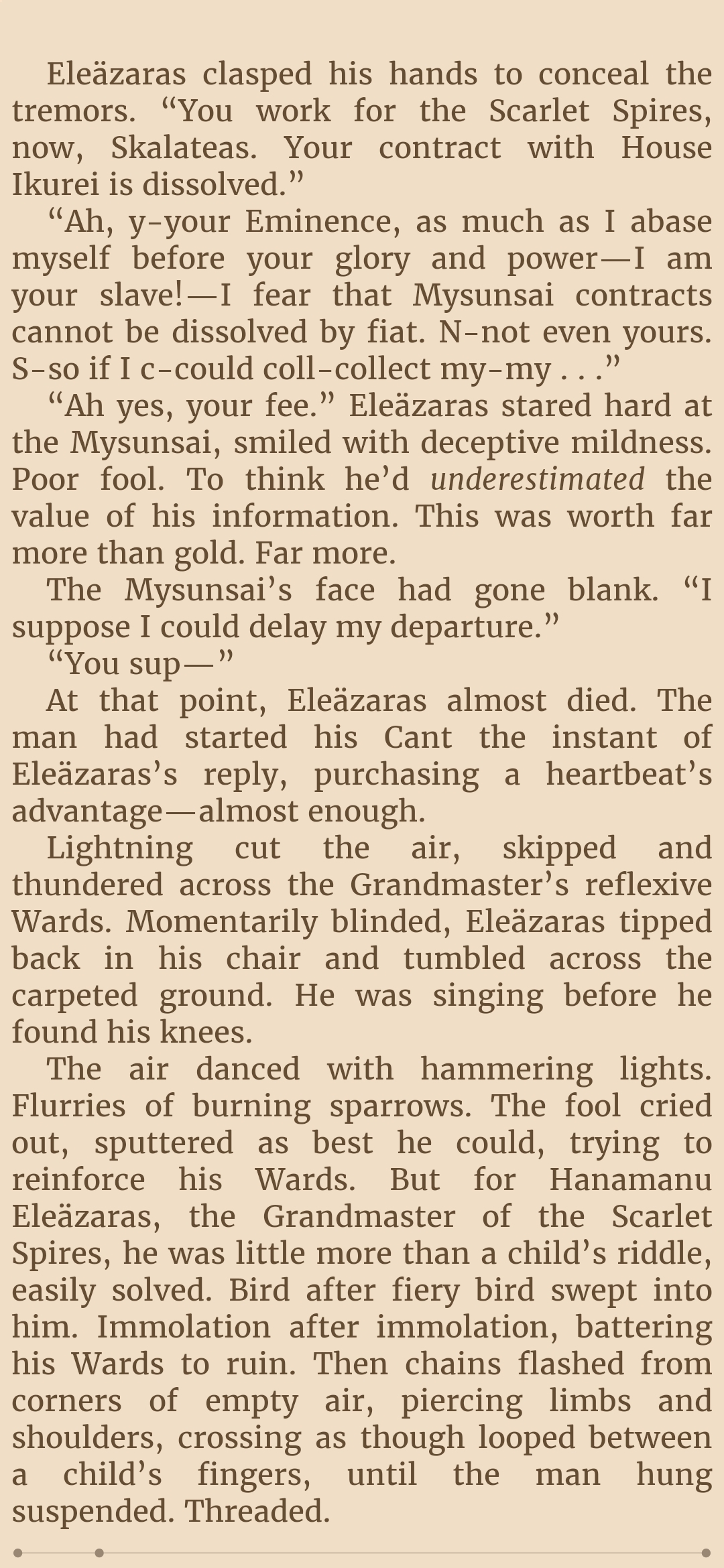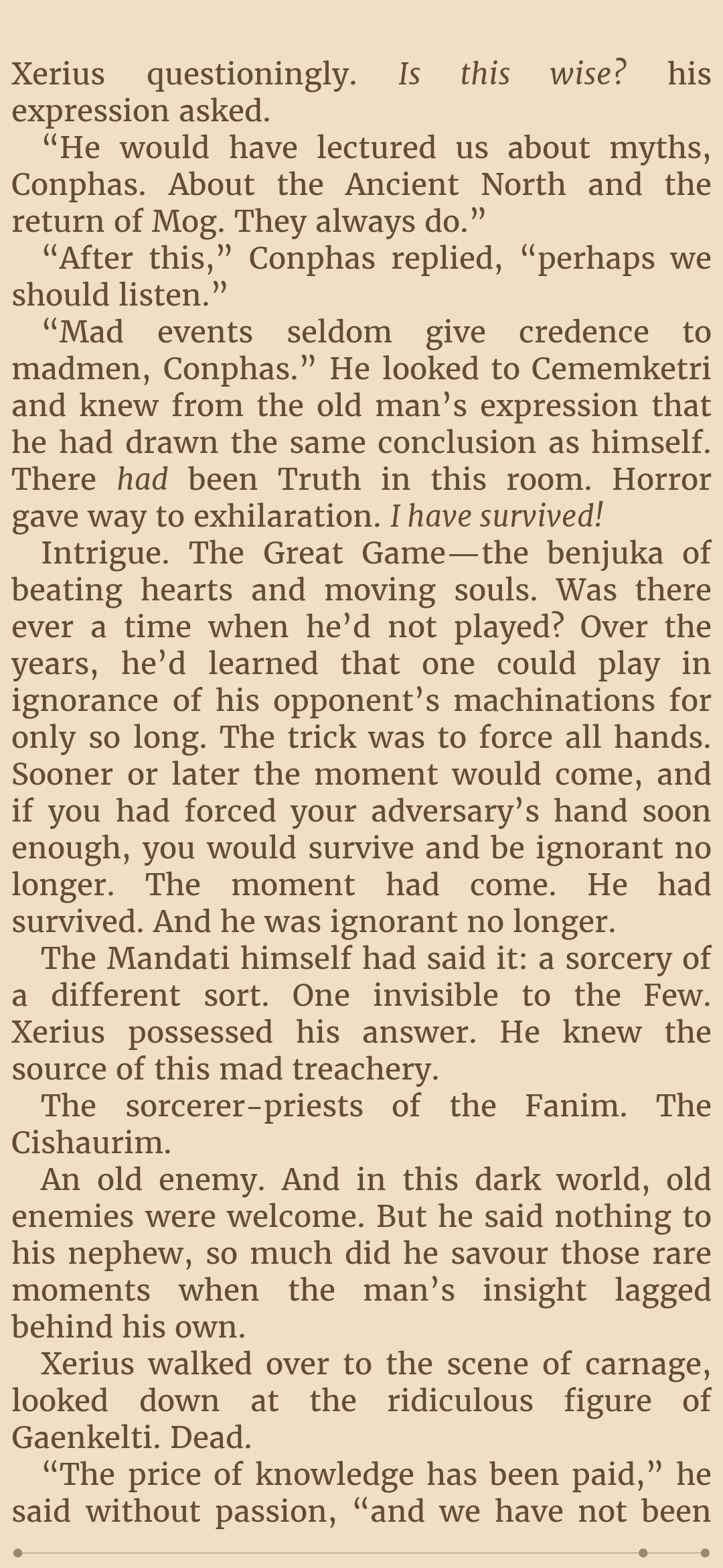Oh Kellhus. How you save me, how you make things philosophical without even intending to. Youre like one of the least human characters in the series and yet, as somebody who loves "human" characters more than archetypal, or representational characters. You hold my interest. I'm aware of your spell, and yet.