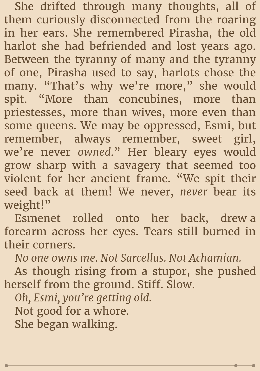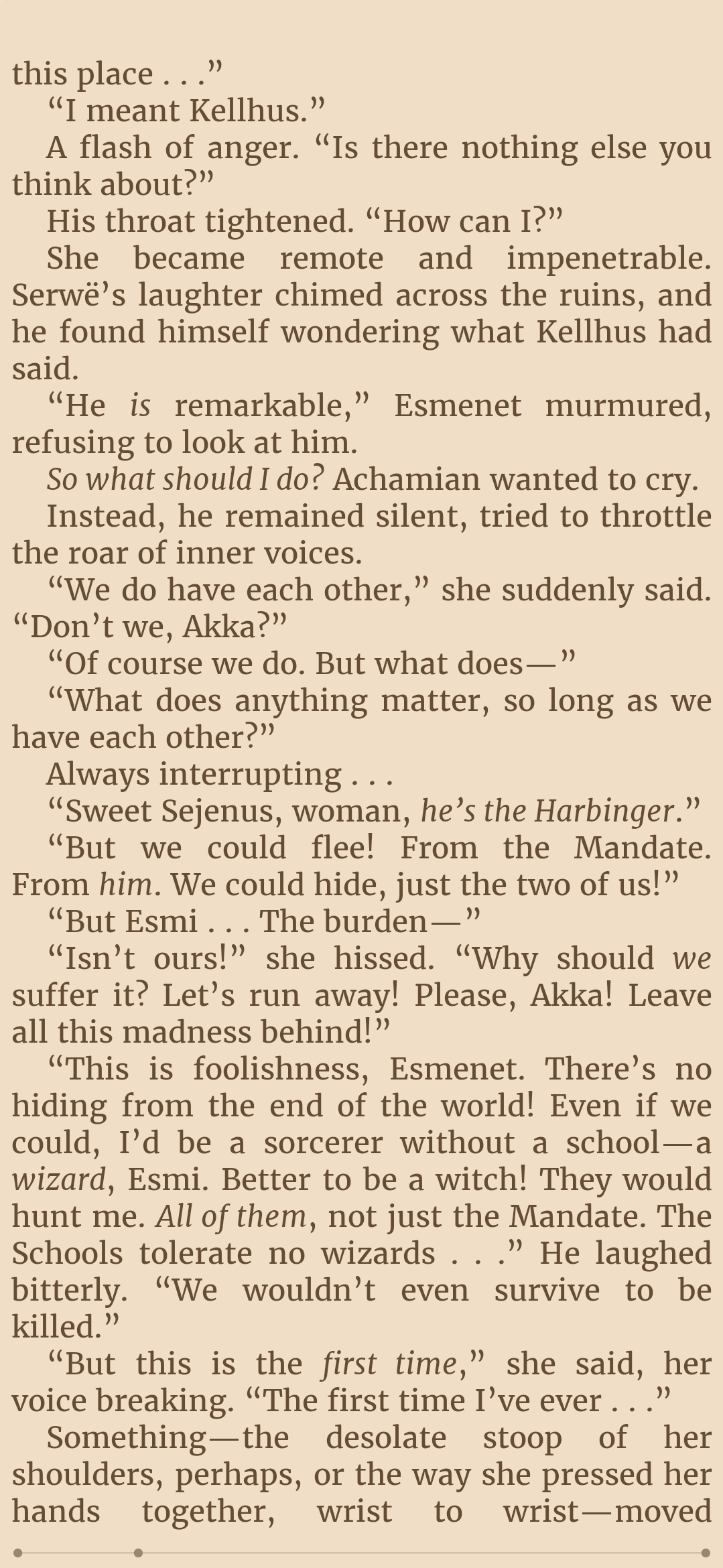 I find this interesting. Im sure this has to be intended, because it just fits too well.But she talks about running away with Achamian from all their problems, and he talks about all the reasons he cant, which essentially can all boil down to him being a sorcerer.But see, the thing is. Is Achamian was likely anything but a Sorcerer, hed never meet Esmenet, but even if we assume they met. She likely wouldn't fall in love with him. Because she said it herself in the first book, what she desires from Achamian, more than his actual self, is his life.Shes assuming that some generic relationship where she could just run away with some dude she loves exist, when that love is so very conditioned by the very thing she wants them to "run away from". By the very thing that keeps them together.Honestly, I forgot the details. But why didnt Esmenet want to stop fucking other men again, and just go to Momemn with Achamian again? I feel like thats the only thing im missing right now to explain this silly relationship.
