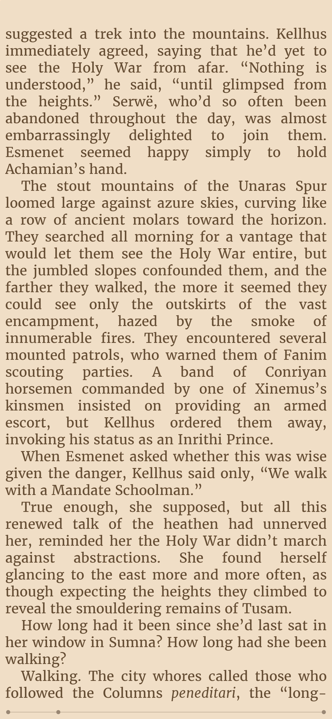 >First I had to endure Serwe chapters, and I said nothing, because I knew she would die>Then I had to endure Esmentet chapters, and I said nothing because she cant be that important >Then I had to endure Achamian + Esmenet chapters, and I started to worry, because Achamian is a pathetic loser who cries and goes insane without sex with Esmenet, who is important, and so Esmenet becomes important and gets more chapters by association>Then Achamian, Esmenet, and Serwe (and Kellhus) all came together, and I fell to my knees in defeat. Even if Serwe dies, the exponential annoyingness of all 3 characters whining about their shallow feelings, is still a great hurdle to overcomeIts a tragedy I cant skip any chapters.