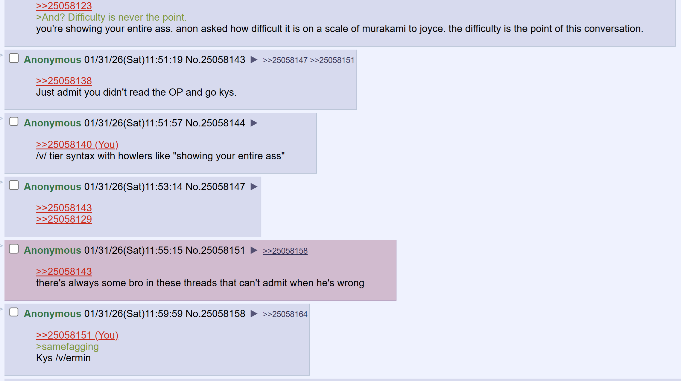 >>25057047Someone's butthurt we don't think his favorite book is as difficult of a read as Joyce.