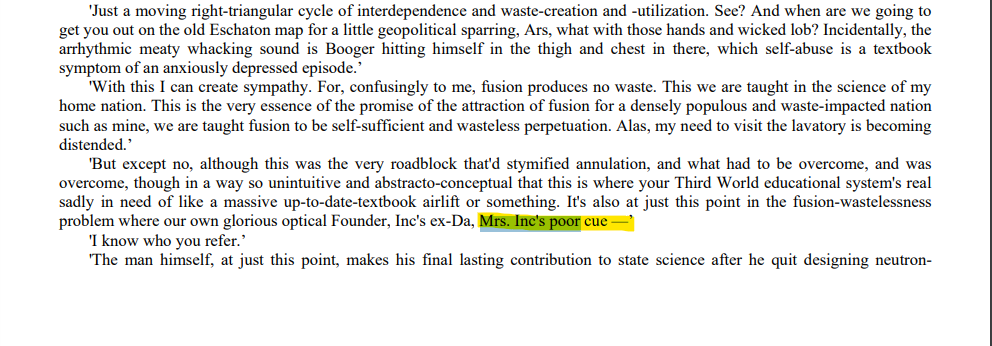>>25059532It has probably been a year since I last made any IJ effort posts. Post occasionally on other books but it is not often I can justify it these days. >>25059632>do you basically think the last 1/3 of the whole book just didn't happen?How do you come to that conclusion? I have no idea how to respond to this, how would the narrator falling back on just relaying internal monologue verbatim, negate the events relayed?>Why would he switch if he is supposed to be a separate character? Because he is giving up doing his job? Relaying internal monologue verbatim requires nothing from an omniscient narrator, does not need to be observant or empathetic, just needs to relay the internal monologue. >Seems far more likely that the perspective switch is an indication of Hal's mental state changing, no?Why not both? After the Inner Infant meeting, Hal recedes into himself, offers little for the narrator to narrate because he is just laying about and doing nothing, thinking over his life and his father's life, watching his father's films, etc. Gately is not much different, just laying there doing nothing. That makes up 90% of the last third, most everything happening is in the heads of two characters.