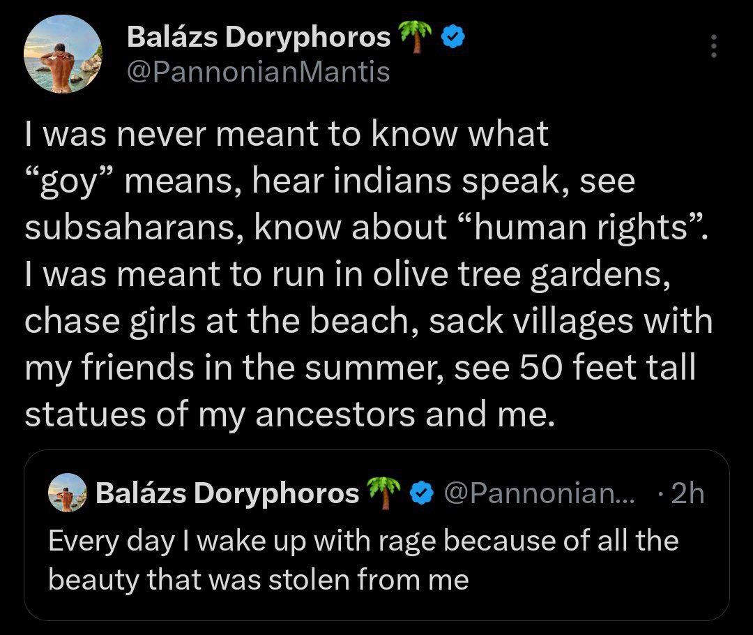 >>25075067>I was meant to be part of the 10% warrior nobility instead of the males put to death, enslaved or otherwise without property, actually growing the olive trees they would never be able to enjoy since they belonged to the heir of their master whose statue is being build