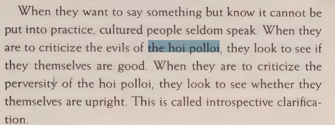AH, WELL! IF PEOPLE have biases and blind spots, they never get to know themselves. The wise view them with magnanimity and forgiveness, and do not criticize. Petty people talk too much out of contempt and attraction. Parents and relatives disagree in their sympathies and jealousies. When people have biases and blind spots, how do they not know themselves?This is why cultured people examine themselves at all times to see if they have any faults. Wearing the appropriate clothing, eating the appropriate food, if they realize when they are at fault and are unable to correct it, cultured people consider this shameful.