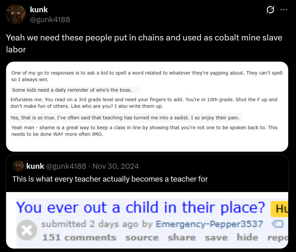 >>25088353>entitled parentsSince this is a redditor, anyone want to take a guess at what this is referring to?>disinterested studentsSkill issue.>our schools[sic] budget crisisI've literally never met a teacher who thought they were being given enough money.>unending grading / lesson planningNo fucking shit.