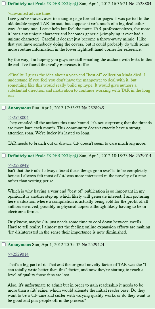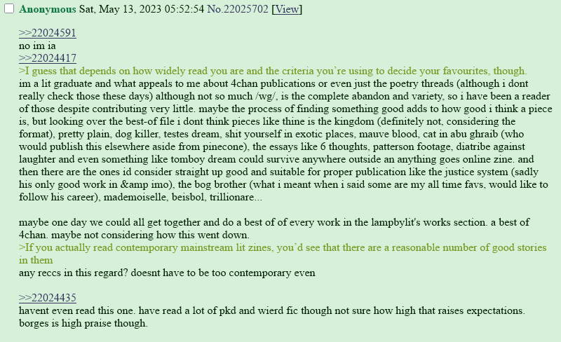 >>25113008>It needs wider horizons to ever be anythingJust let it be a /lit/ mag. It doesn't need to be more than something with niche, passing novelty on /lit/. Trying to be a real literary magazine is something entirely different from having fun putting something together on /lit/. Doesn't need to be serious, just make it seem fun and free enough for anons to contribute to, particularly stuff they don't think they could share elsewhere.>Being ran by some memeing retard posting squirrel soijaks is going to kill it.I agree with this though.