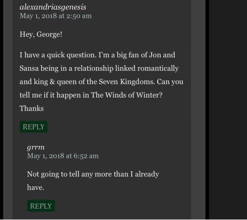 >>25135323Did he ever reply any question about jon and danys romance in one of these qa ??