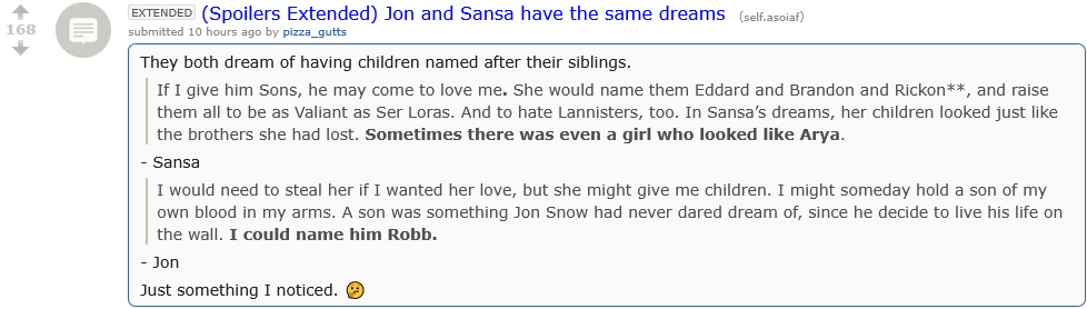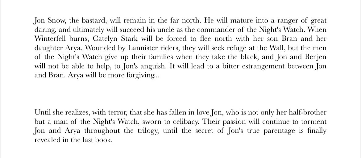 >>25135259>>25135279George has been literally screaming in various texts that he's aiming for a Jon and Sansa romance, he edited the Stark family tree to add a previous Jon and Sansa marriage between uncle and niece lol.>>25135323And he's told us a lot, that image pretty much confirms it, there's a ton of Jon and Sansa evidence. Maybe if I get bored enough I'll do a big post about it.