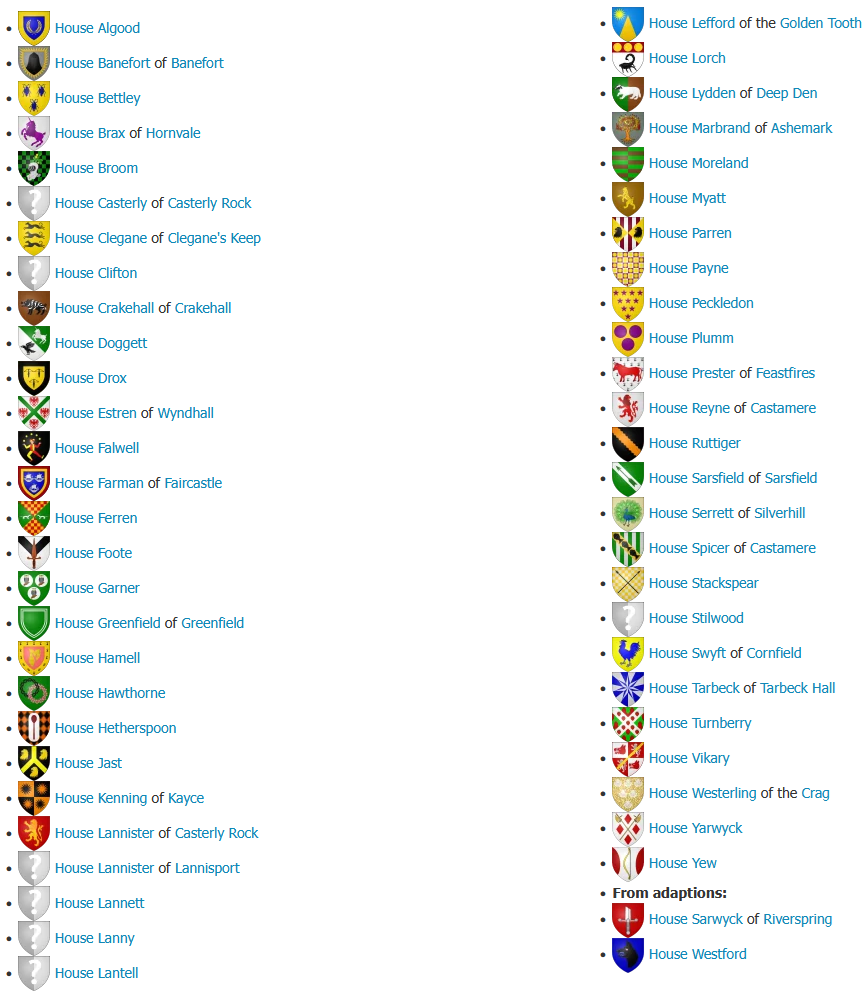 >>25137329All of those houses you named are pretty prominent. I was thinking much smaller houses who would have absolutely thrown their daughters at Tyrion. Pic related is just the houses from the Westerlands, so they had a ton of choices. But Tywin would have refused them all or didn't even deign to think on it because shit and gold or however the quote goes.