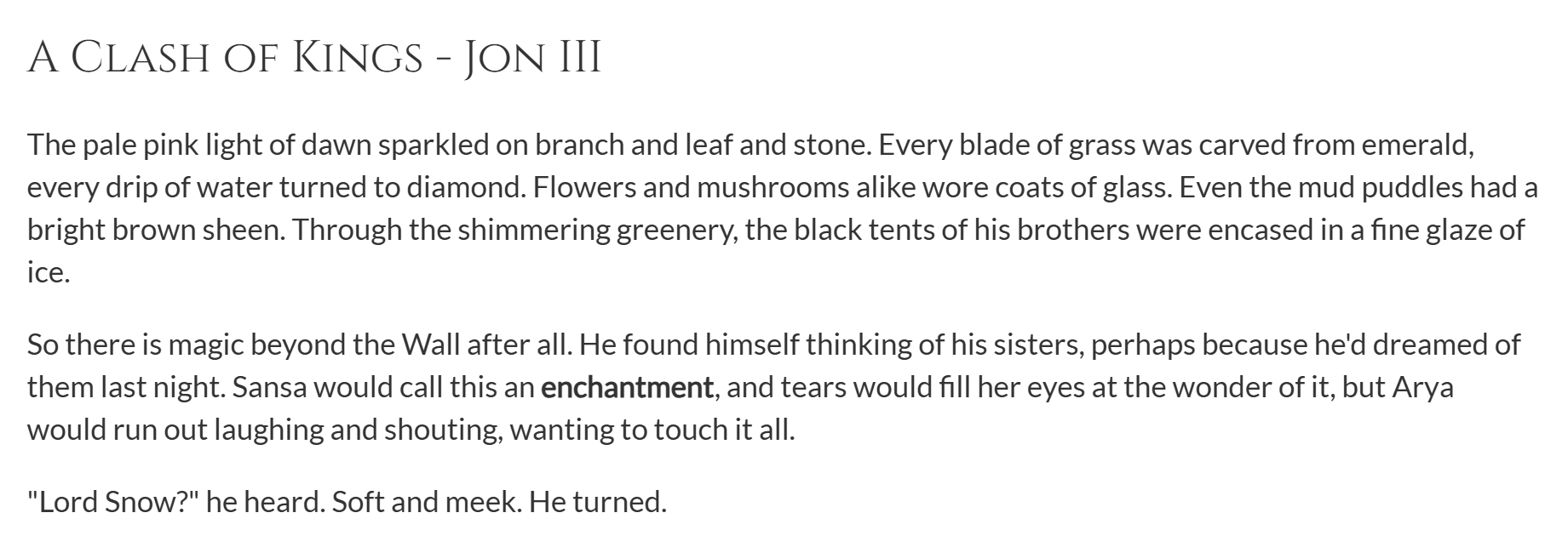 >>25135179>>25135202You know people love these parallels but they hardly work right? It didn't work in Naruto, it won't work here. Meanwhile, in the actual books, Jon and Arya are thinking about each other every chapter. Sansa has remembered Jon exactly one time, and Jon remembered Sansa never.