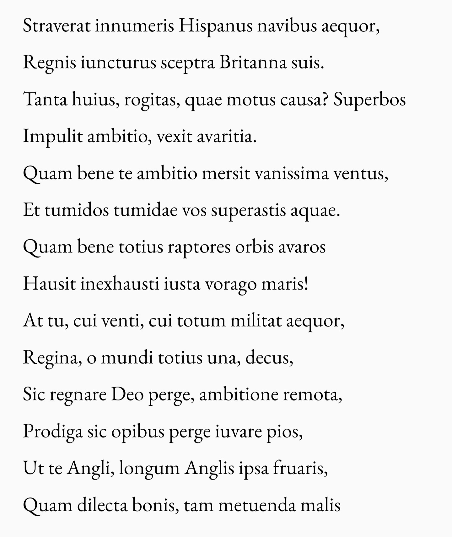 Opinions?Protinus ad castra incedit vallumque superbum,Hic fera turba virum clipeis munita minatur.Stat castrum immensum celsis pinnacula palis,Quae nubes tangunt, candent ceu frigora Tauri,Undique densa aditurum saeva cacumina terrent.Ire arcent Murem latis umbonibus hostes,Pulsantesque retro praeciso momine pellunt.Ille sed impavidus, rapido super aethera saltu,Transilit hostiles turmas cristasque superbasVorticeusve ferit: Velox tot scuta repellit!Castra tenet victorque altas evadit in arces.(from >>25200757)