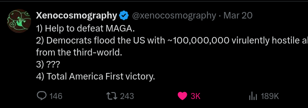 your mistake is to be so obsessed with israel and jews that you become blind to real-world history and politics and what is to be done practically. the >>>/pol/ effect. now you're hurting the right by being anti-maga and moving the independent voters into democrat who will flood your country with never-seen levels of immigrants where it will become impossible for anyone on the right to ever get in power again.