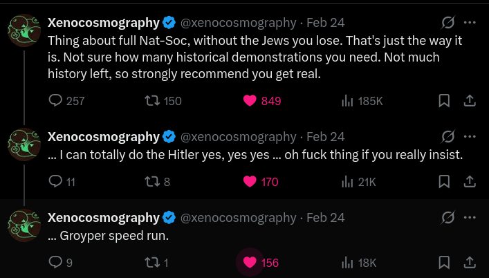I didn't bother taking screenshots, but approximately a year ago he reposted several obviously fake AI videos and was tweeting about them in earnest as though they were real. His mind is shot