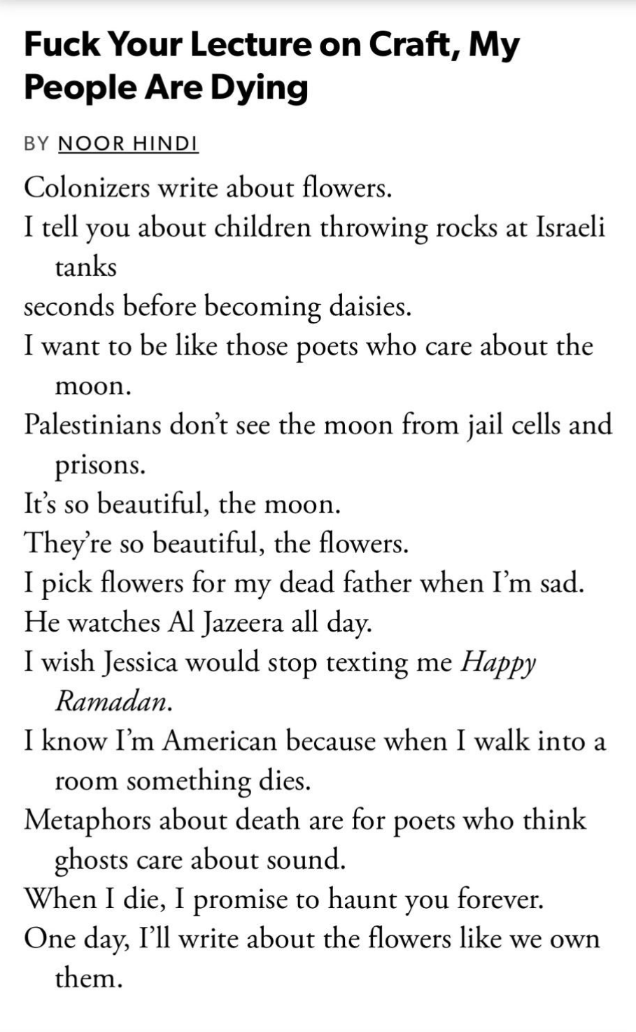 >>25155590If I wrote a poem exactly like this but about Israel being threatened with erasure, it would not get published, indicating the cultural institutional preference for the Palestinian cause. You guys won't like hearing it, but Zionism is the new punk.