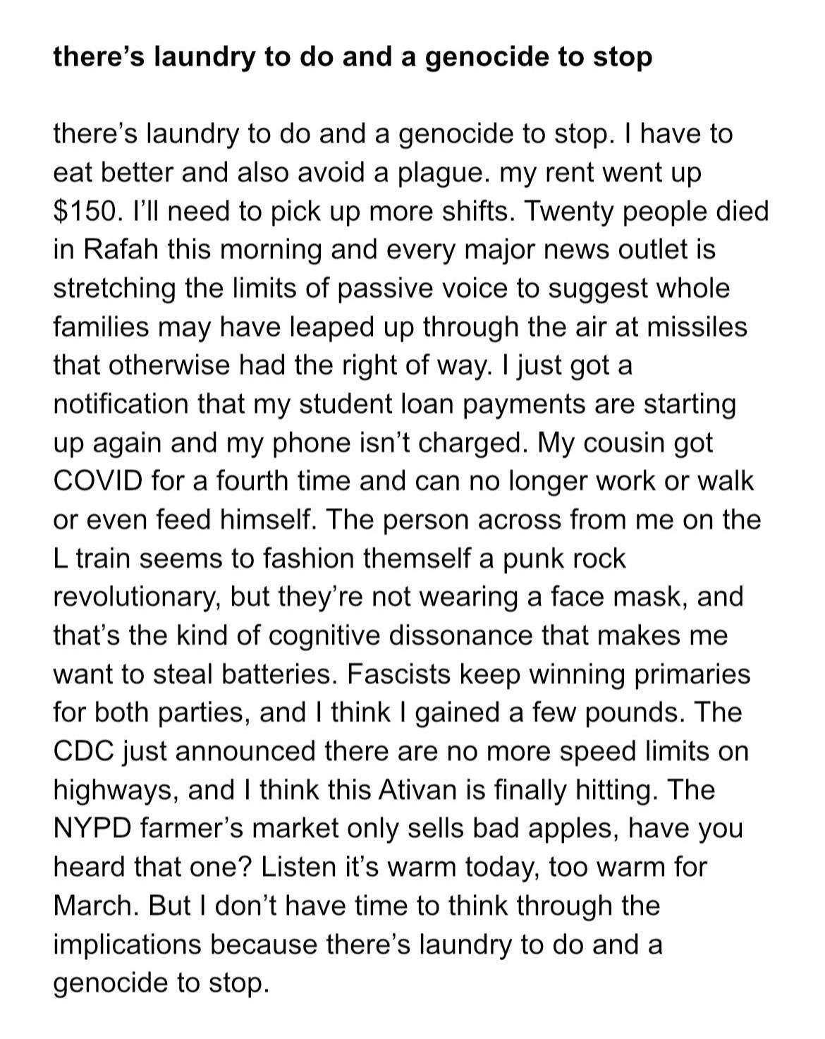 >>25155590>FUCK poetry because it does NOTHING to stop the IDF>Here's a poem I wrote about that yes this is activismChrist, I hate this kind of poetry so fucking much. I agree with the poet (death to the IDF) and all that, but do poets really think that their work foments social change? Like seriously? If you're an American poet writing today, your audience is -- very generously -- 5,000 people. And most of those people have graduate degrees. And the vast majority of them already agree with whatever political take you're so "bravely" singing about. Like what is the idea here, that people who attend AWP will read this poem and go "by god, I didn't realize that writing nature poetry does nothing to stop the war in Gaza! wowza"? Gotta love a poet's total and utter delusion