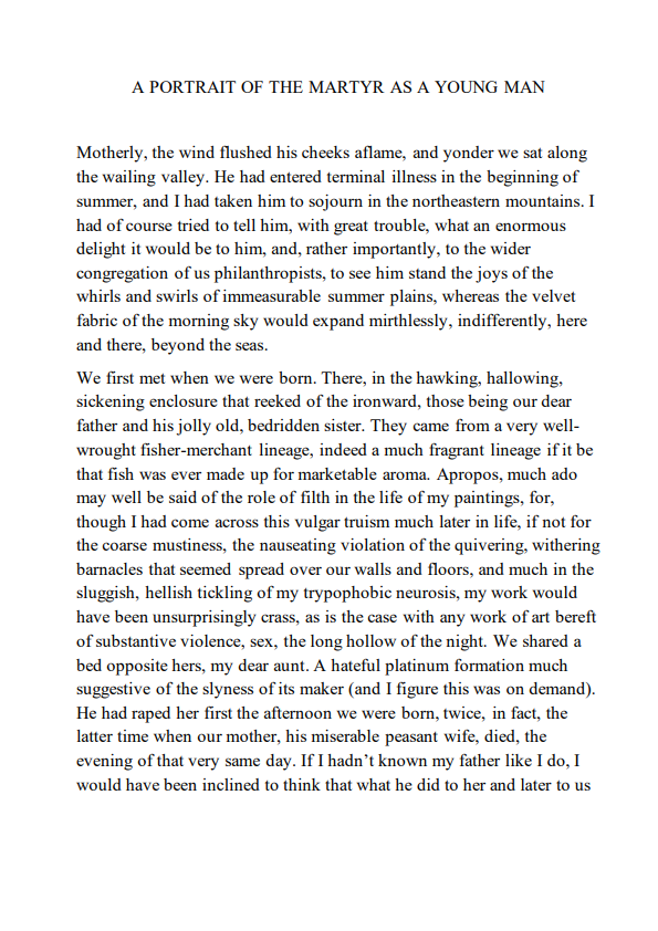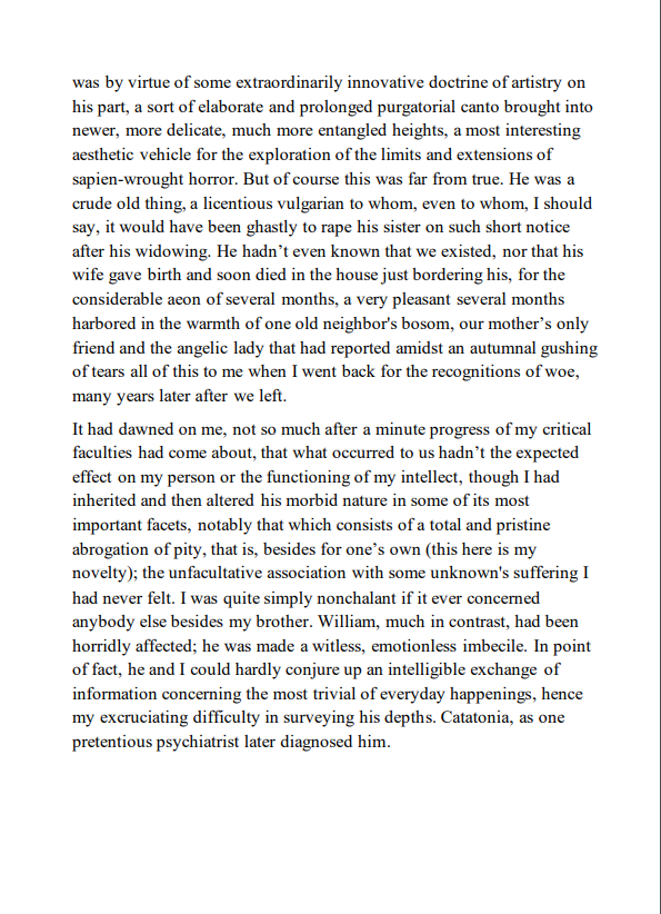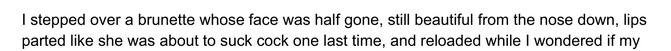 >>25168535It speaks mountains that this is the best excerpt in the thread so far. It's messy, unpolished, cumbersome in some places, but for once actually interesting to read. There's a flow here that keeps me engaged, I'd say that's talent enough, even if this is just a series of bite sized bits of ultra violence.