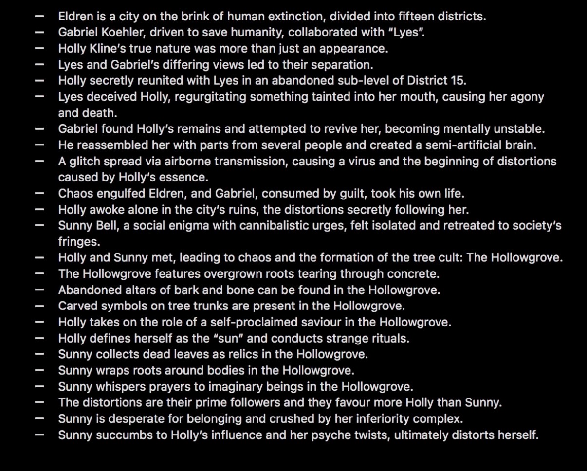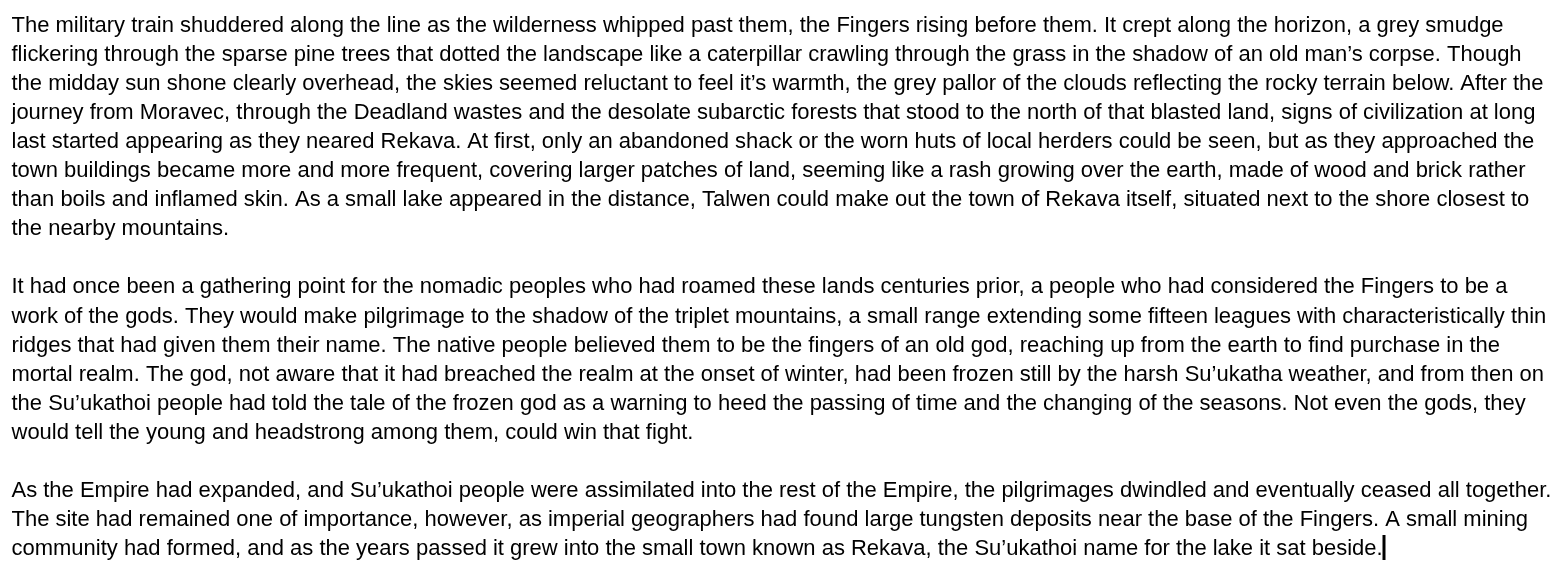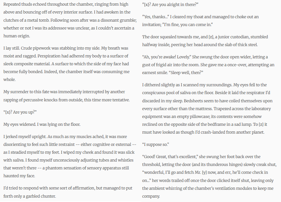 >>25170824Thanks for the feedback. I've added more description to the first scene, and some obvious points of comparison between the two settings. The first scene is meant to be imagined as similar to a well-lit dentist's office with shadowy figures operating on him. The actual room he's sleeping in is in some dark chamber that's constantly groaning and creaking but with idenfitiable characters. I'll highlight those comparisons and once I'm happier with the wording and pacing then I'll post it.>Maybe you could go with fewer descriptions and more sensory?A worry I have with this is that I'm trying to establish a distinct tone for each setting, the sensory detail (at least the invasive and uncomfortable stuff) I want to be confined to the simulated world, and environmental descriptions I'd like to be shown more in the real world, so that after a few cycles of switching the reader can determine which we're in based on the style of writing alone. That's the plan anyway, in practice that might be asking for too much work from the reader.