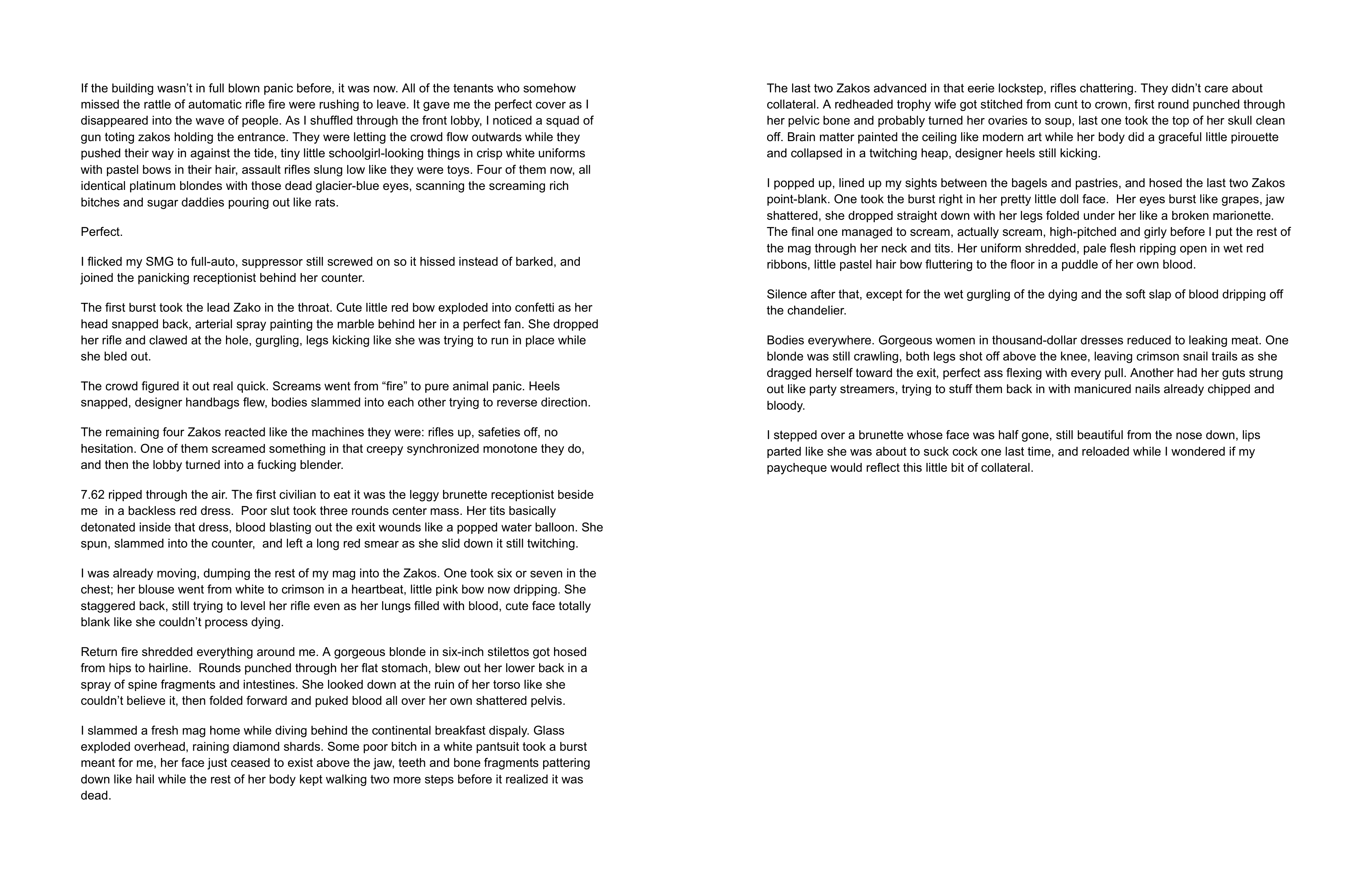 >>25168535>All of the tenants who somehow missed the rattle of automatic rifle fire were rushing to leave. Why were they rushing out if they "missed the rattle of automatic rifle fire"? They either heard it and panicked, or they didn't and wouldn't be rushing.>It gave me the perfect coverThis does not need to be stated explicitly. It's obvious.>As I disappeared into the wave of people.>As I shuffled through the front lobby,"As I" in two back to back sentences.>They were letting the crowd flow outwards while they pushed their way in against the tide,So they were just pushing forwards against the flow of people? How exactly were they "letting" the people "flow outwards"? If they are forcing their way in, they aren't passively permitting anything, which the word "letting" implies. Also, "outwards" sounds awkward and is redundant. People leaving a building go out.>tiny litttle schoolgirl-looking things in crisp white uniforms with pastel bows in their hair, assault rifles slung low like they were toys. Four of them now, all identical platinum blondes with those dead glacier-blue eyesBad, lazy description. You're again telling the reader explicitly what to picture in their mind. This is bad. Reads like notes you'd leave yourself.>assault rifles slung low like they were toys. What makes a low-slung rifle look like a toy gun? How exactly are these two things related?>Four of them now,What do you mean by "now"?>scanning the screaming rich bitches and sugar daddiesWhat does "scanning" mean here? Do you mean they were looking everyone over, scanning with their eyes? Because "scanning" on its own does not make sense. It also implies a sort of detachment. But they're right up against the crowd, bumping into all the people who are desperately trying to get out. So, they wouldn't even see anyone. Maybe just the people directly trampling them, since they're "tiny". Even then, what would they see? Legs? Bellies? In that situation, you can't maintain the level of detachment needed to "scan".>pouring out like ratsWhy are they "rats" now? The people were just a "wave". You were talking about "flows" and "waves" and "pouring out". Horrible. Reads bad.>Perfect"Perfect" again. You used "perfect" in the second sentence.