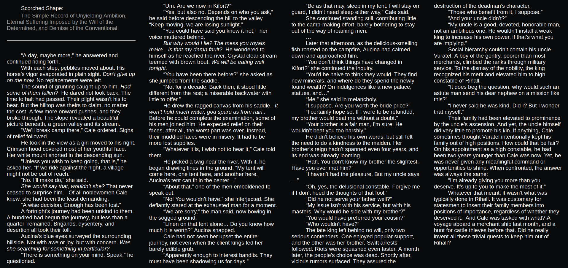 >>25161345Okay... I'm just concerned about being verbose. The 2nd attempt:>With each step, pebbles moved about. His horse’s vigor evaporated in plain sight. Don’t give up on me, now.>The sound of grunting caught up to him. Had some of them fallen? He dared not look back. Time to halt had passed, and their plight wasn’t his weight.>The hilltop was theirs to claim, no matter the cost. A few more onward pushes, and they broke through. The slope revealed a beautiful picture beneath, a green valley and its stream.