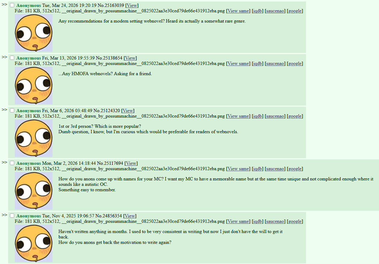 A Dragon among Men EditionStubbed >>25151804>What is /wng/ — Web Novel General?A general for readers and authors involved or interested in the growing phenomenon of 'web novels', serialized English fiction posted to websites such as: Royal Road, Webnovel, Scribblehub, Wattpad, Archive of Our Own, Spacebattles, HFY, various personal author websites, and more>Why read web novels?Not for prose or tight editing or deep themes, frankly. As a whole, web novels are infamous for content sprawl and pacing issues. If you enjoy having millions of words to sink your teeth into to get to know the world and characters, though, you may be interested. Keeping up with other readers on a weekly basis to discuss the story's events unfolding is another perk, in the same way discussing an ongoing TV show might be.>Why write web novels?Ease of access & potential for Patreon earnings. Many successful authors gain an audience on their website of choice and funnel their readers into a Patreon. See graphtreon.com/top-patreon-creators/writing for an idea of what some are earning.Also, once an author has earned a fanbase, transitioning into an Amazon self-publishing career is several orders of magnitude easier than starting 'dry'.>/wng/ authors.https://docs.google.com/spreadsheets/d/e/2PACX-1vSNZali-jIk2MASsAWVf8N7A8BlSyzPbAFV_BhsA5Ip3SWfMPWKxaXf8Pdb7f0TgFyWis31BzirtPeR/pubhtml>Advice for Noobs!##READ THE FOLLOWING BEFORE ASKING FOR HELP##Running your story like the business it is:www.royalroad.com/forums/thread/116847On writing web serials:alexanderwales.com/how-to-write-a-web-serial/Sanderson's Writing Lectures 2025:https://www.youtube.com/watch?v=MEUh_y1IFZY&list=PLSH_xM-KC3ZvzkfVo_Dls0B5GiE2oMcLY Recommended web novelsrentry.co/d2yvczroAnon's guide to successrentry.co/RRBasicGuideFAQrentry.co/pytefpxn