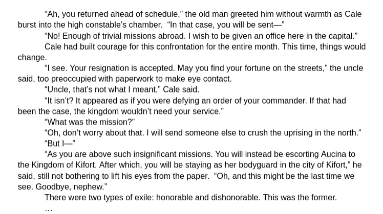 >>25161291>With each step, his horse’s vigor faded, and the pebbles scattered underfoot.These commas are incorrect. Imagine reading...>With each step, and the pebbles scattered underfoot."his horse's vigor faded" in this example is an independent clause.I would have written this as.>The pebbles scattered underfoot as vigor faded with his horse's every step.But that's just me.>Plight of his companions wasn't his burden to bear.Typically nouns at the beginning of sentences need articles, or determiners even if they aren't singular.>Horses ran around the track.>Car drove through the intersection.>Bank lent me money.Are more correctly written as.>The horses ran around the track.>A car drove through the intersection.>My bank lent me money.In common speech is only okay to do this conversationally.>"How did you afford your new fridge?">"Bank lent me money."This is okay, because the determiner "my" is already implied by the conversation's context. As often a person doesn't have more than one bank.