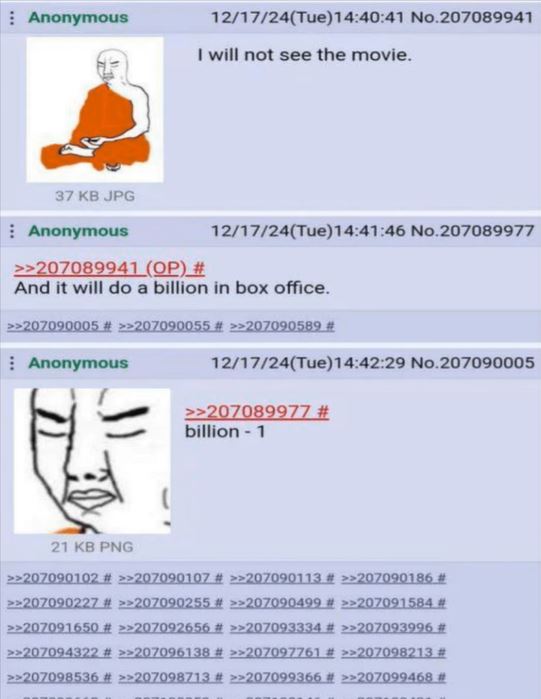Also, 4chan would go radio silence overnight if they actually ignored trash from entertaiment and just focused on their interests. Discussing the merit of things you personally are fond of doesn't get as many (You)s as complains, impotent seething and outrage engangement that most of the internet users nowadays loves so much. These things keep being made because all it takes it's your attention to keep seeing them pop up.