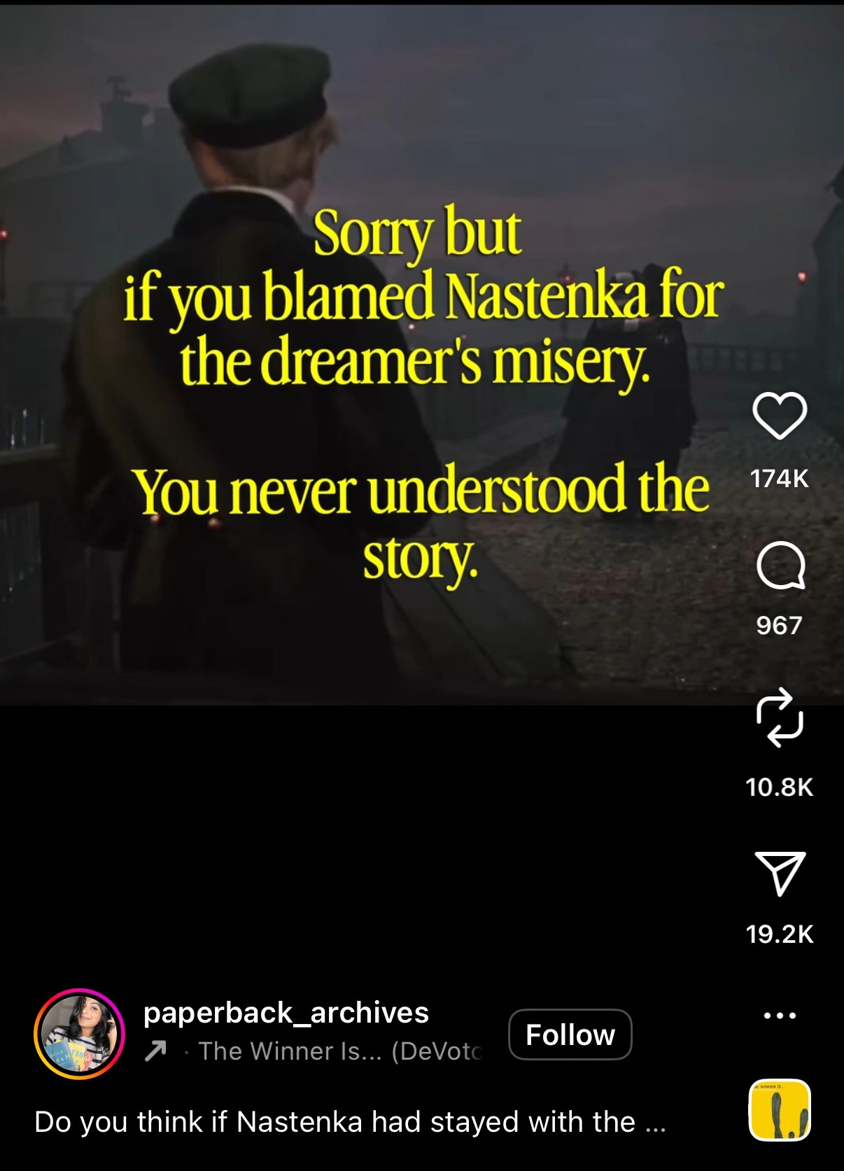 Did you know it's now common for zoomers to read White Nights and actually think the narrator is the bad guy and the girl did nothing wrong