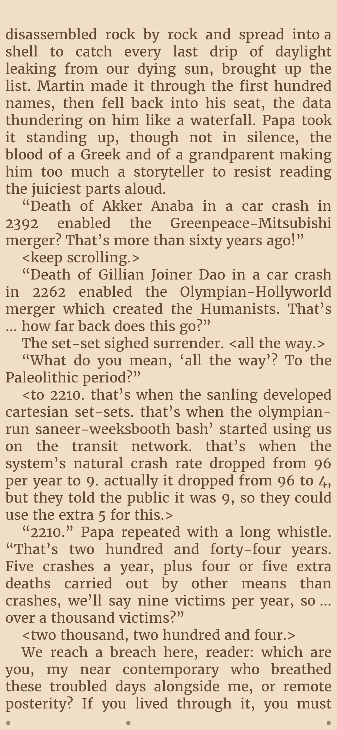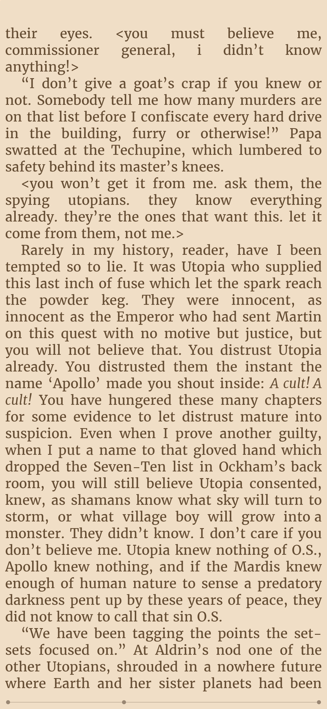 So is Mycroft coping and propagandaing about the Utopians here? Its hard to believe, knowing that the Author themself likes the Utopians, so it wouldnt be surprising if theyre just the defacto good innocent guys of this whole Hive system, theyve certainly been presented as such, and if you wanted to pull an ole "Good guys are actually...da bad guys???" subversion, then thats already accomplished with the Humanists and Saneer bash whom we first met in the story.So I have a disappointing feeling that the Utopians are infact as innocent goody two shoes as presented.