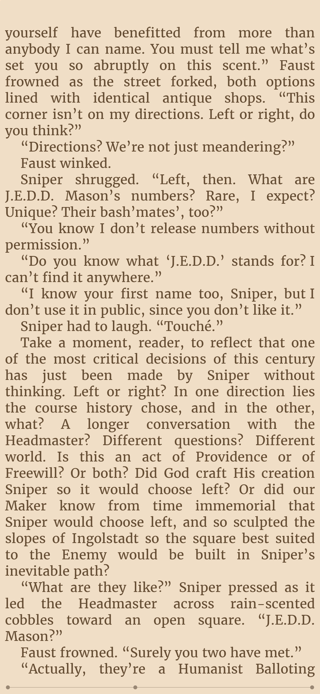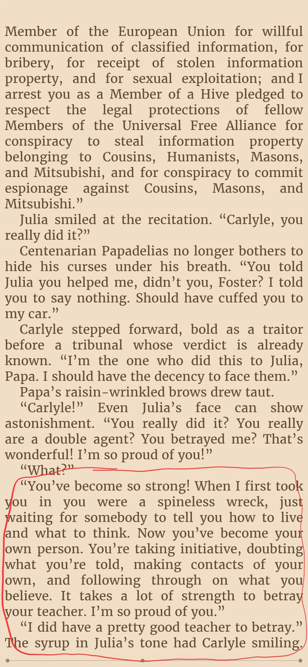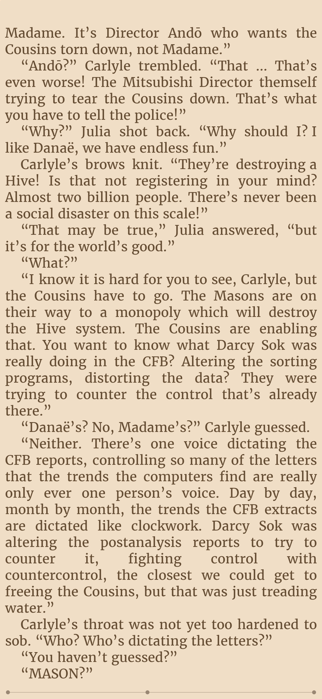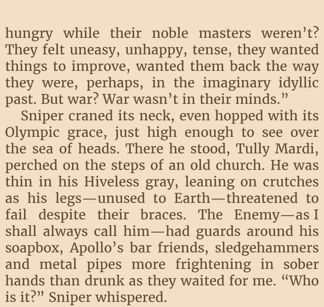 So is Mycroft coping and propagandaing about the Utopians here? Its hard to believe, knowing that the Author themself likes the Utopians, so it wouldnt be surprising if theyre just the defacto good innocent guys of this whole Hive system, theyve certainly been presented as such, and if you wanted to pull an ole "Good guys are actually...da bad guys???" subversion, then thats already accomplished with the Humanists and Saneer bash whom we first met in the story.So I have a disappointing feeling that the Utopians are infact as innocent goody two shoes as presented.