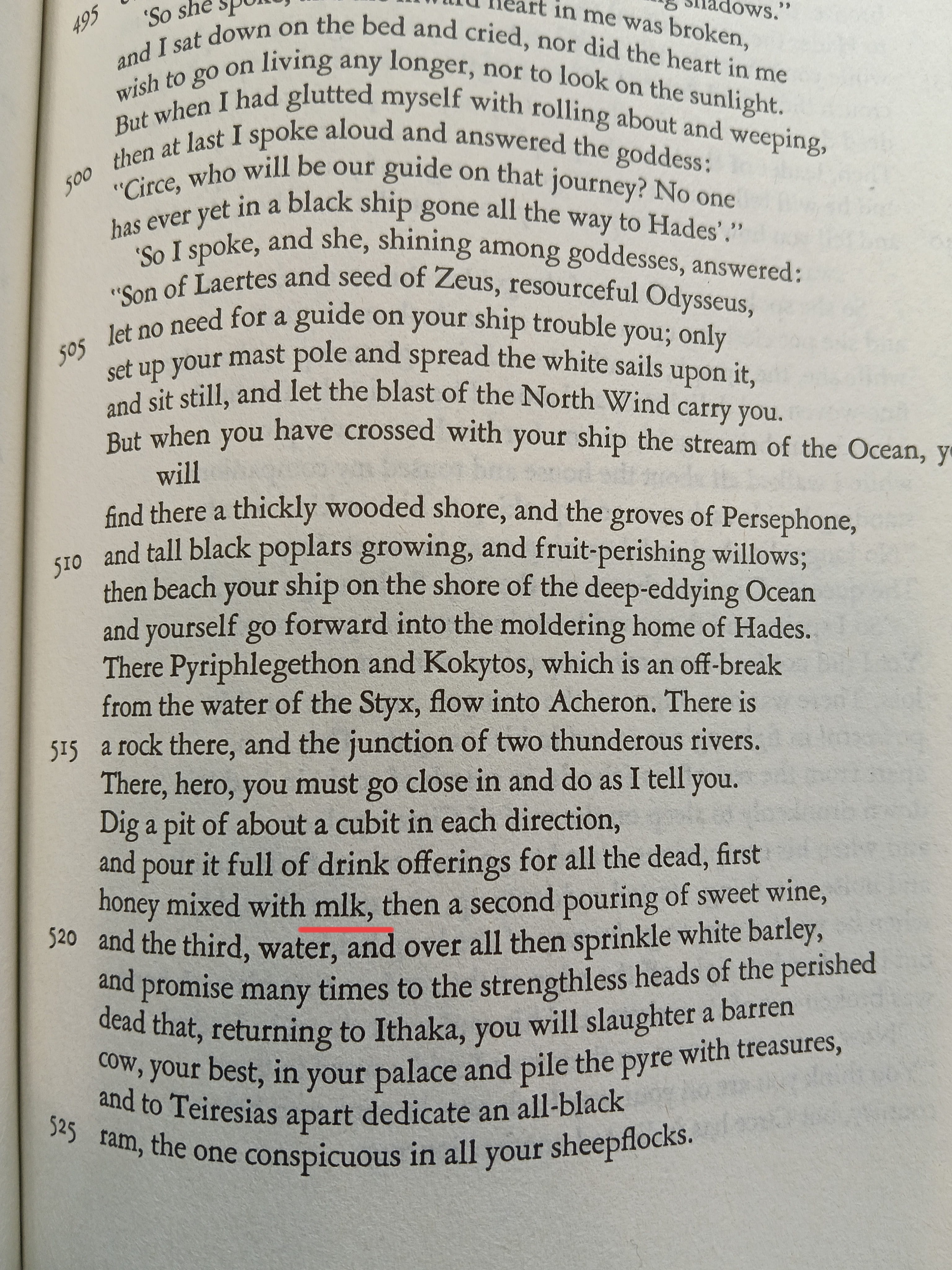 I have only encountered this once or twice before but just discovered this typo of 'milk' in the Harper Perennial Modern Classics edition of Lattimore's translation of Homer's Odyssey. Just checked a pdf copy online and it occurs there also. Have any of my fellow anons encountered typos in books?