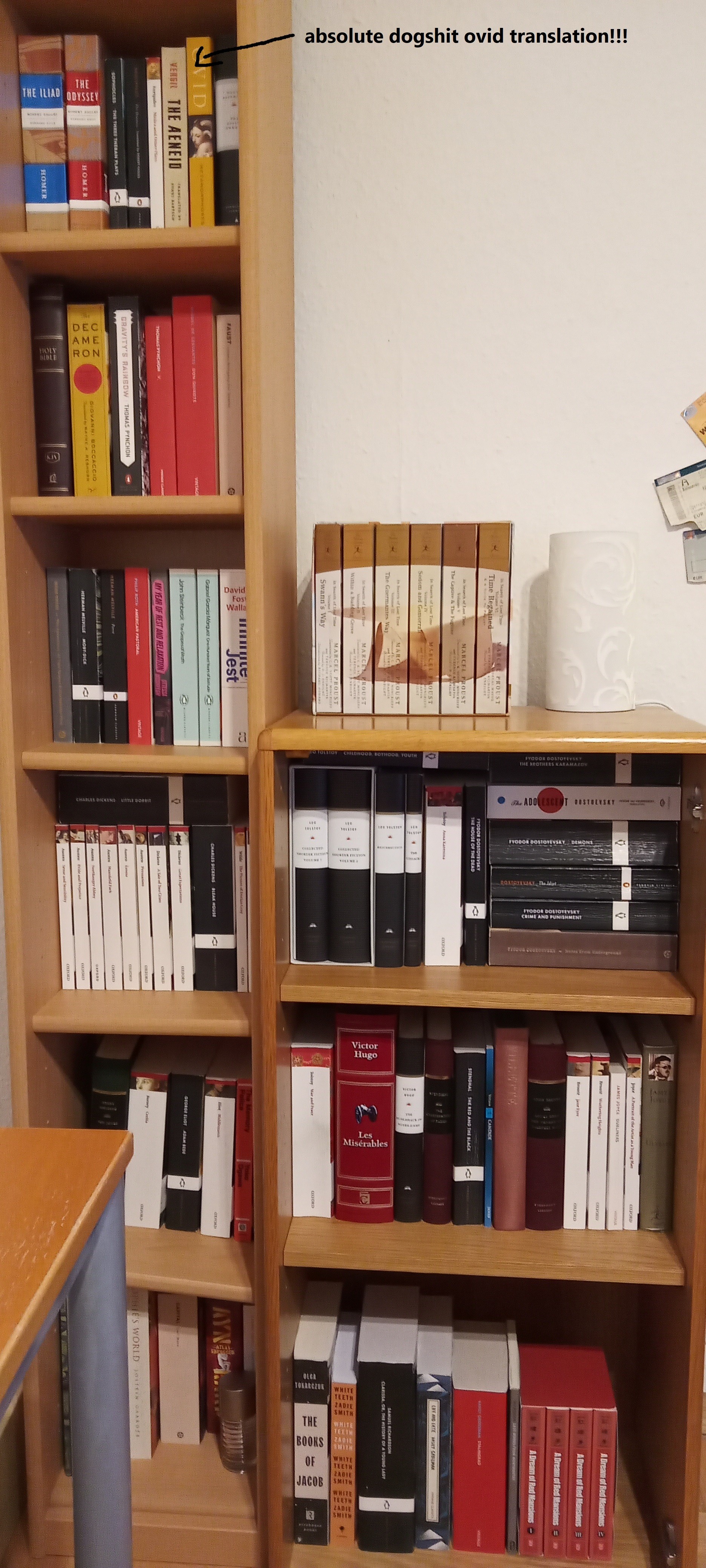 >>25171137I don't live in the US or UK so it's a challenge for me to find used books. I once drove half an hour to a "good" (according to Google reviews) used bookstore and all I found were crappy WW2 guilt nonsense, self-help trash, and cookbooks. Maybe a German translation of Shakespeare or something. I do hunt for used books online, but shipping costs usually make it so I pay the same as I would for a new book (even more most of the time!), so I might aswell order them new.And I do read them, thanks for your concern!>>25171444Well, the works by English speaking writers notwithstanding since I'm fluent in English and therefore see no reason not to read them in their original language, I just find that there's often more scholarship and information (as it pertains to accuracy and the author's voice, that kind of thing) to be found for English translations. I also find that a lot of German translations are extremely mediocre. For example I bought and tried to read Svetlana Geier's translation of "Die Brüder Karamasow" (probably the most acclaimed German version) and it was pure nonsense. She invents and changes so much it would make Constance Garnett blush. German books are usually more expensive most of the time too. The aforementioned German translation of Dostoevsky cost me 22€ for a paperback just as shabby as the 8-10€ Oxford or Penguin ones. I'm also more used to reading in English so I've settled on just reading German works in German and reading everything else in English.