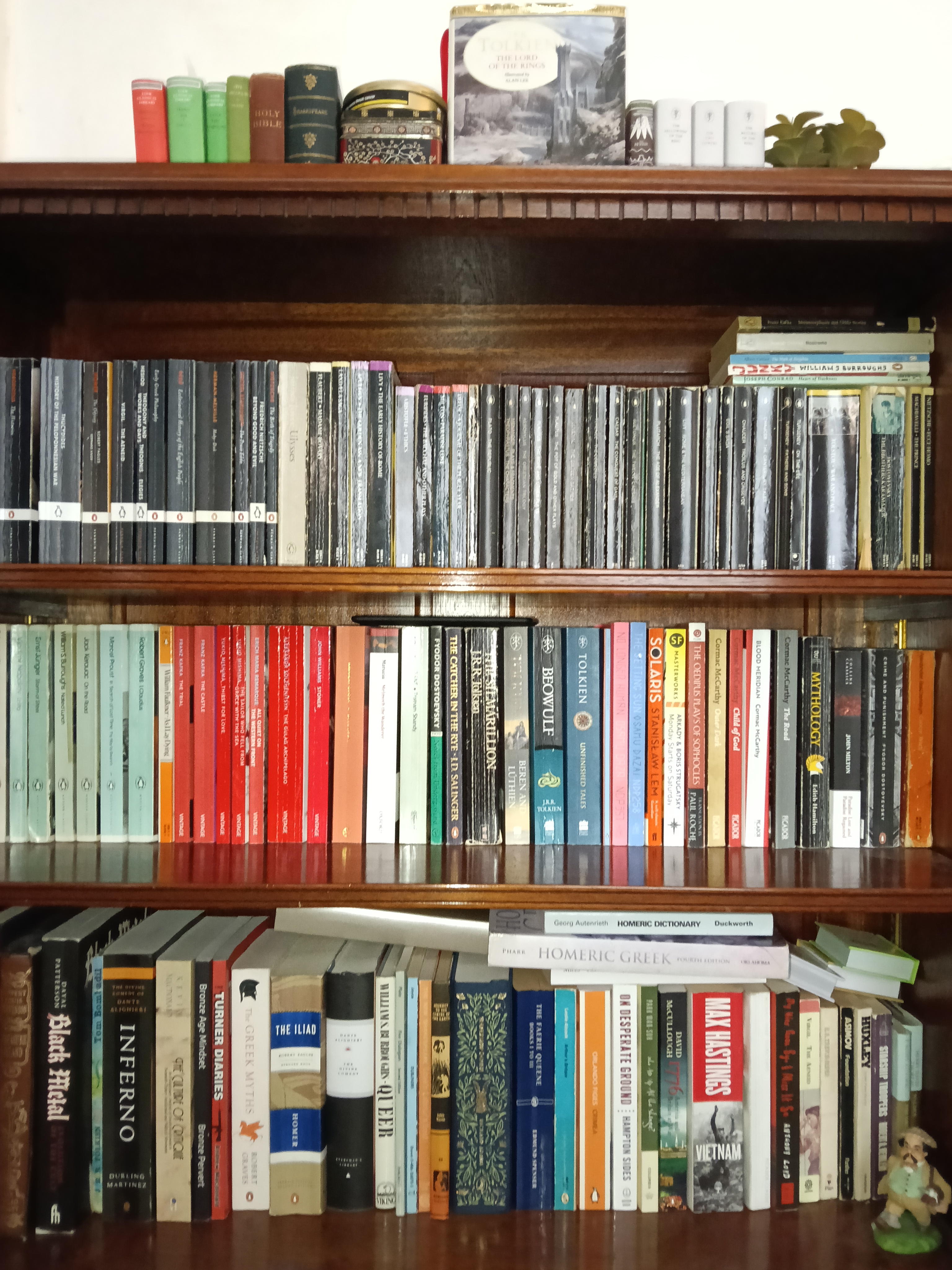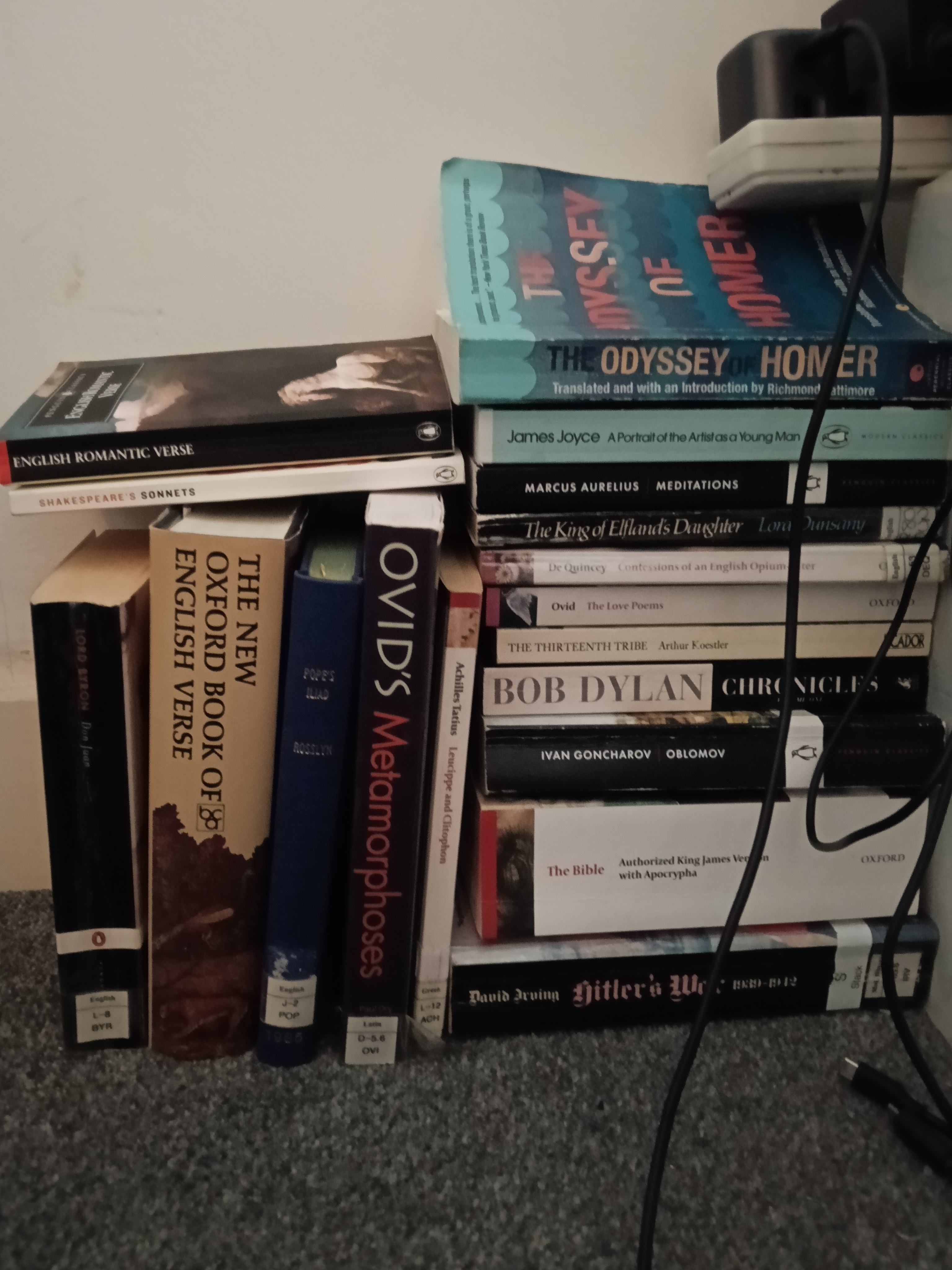 >>25169587My shelf in the living room, mostly books I've read but want to keep, though not all. The Homeric learning books are just there while I'm cleaning up my writing desk. I will reply with my bedside stack which is my currently readings, my to reads, books I go to a lot like poetry, or things I need to dip in and out of for my studies.